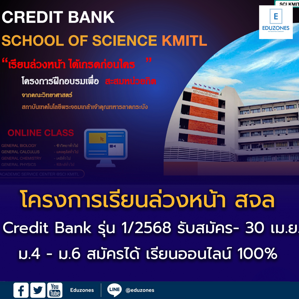 EZ Webmaster March 6, 2025 EZ Webmaster March 6, 2025 โครงการเรียนล่วงหน้า สจล. Credit Bank รุ่น 1/2568 Credit Bank รุ่น 1/2568 (เปิดรับสมัคร 1 มีนาคม 2568 – 30 เมษายน 2568) วันรับสมัคร : ตั้งแต่วันนี้ – 30 เม.ย. 68 วันเริ่มเรียน : 6-28 พ.ค. 68 (Online) วันสอบ : 7 มิ.ย. 68 (Onsite ณ คณะวิทยาศาสตร์ สจล.) ผู้เรียนเลือกเรียนได้สูงสุดเพียง 2 รายวิชา/คน เท่านั้น เนื่องจากมีบางวิชาเรียนในวันและเวลาเดียวกัน ตัวอย่างเช่น เลือกเรียน “แคลคูลัสทั่วไป และ ฟิสิกส์ทั่วไป” หรือ “แคลคูลัสทั่วไป และ เคมีทั่วไป” *หากต้องการเรียน 2 รายวิชา ให้กรอกแบบฟอร์มสมัครทั้ง 2 ฟอร์ม* สมัครเรียน “แคลคูลัสทั่วไป” หรือ “ชีววิทยาทั่วไป” Click https://forms.gle/r4dPEmDNS4T2npM28 สมัครเรียน “ฟิสิกส์ทั่วไป” หรือ “เคมีทั่วไป” Click https://forms.gle/X2uDxEodoQDsWZFn6 รายละเอียดเพิ่มเติม Click (ปรับ 05-03-2568) รายละเอียดโครงการ CREDIT BANK.pdf กรุณาอ่านรายละเอียด ก่อน การสมัครเรียน “ขอสงวนสิทธิ์ในการคืนเงินค่าสมัครเรียนทุกกรณี” . หมายเหตุ : เฉพาะผู้ผ่านการอบรมเท่านั้นจึงจะได้รับใบ Certificate ซึ่งสามารถใช้ประกอบ Portfolio ได้, การสอบเพื่อสะสมเครดิต เพื่อขอเทียบโอนในรายวิชาของคณะต่าง ๆ ของ สจล. ต้องได้ระดับคะแนนตั้งแต่ C+ ขึ้นไป