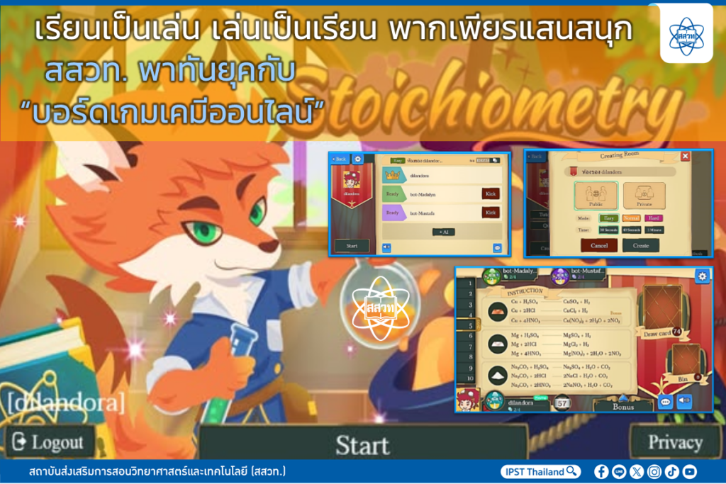 EZ Webmaster March 12, 2025 EZ Webmaster March 12, 2025 เรียนเป็นเล่น เล่นเป็นเรียน พากเพียรแสนสนุก สสวท. พาทันยุคกับ “บอร์ดเกมเคมีออนไลน์” สถาบันส่งเสริมการสอนวิทยาศาสตร์และเทคโนโลยี (สสวท.) นำบอร์ดเกมออนไลน์มาประกอบการสอนวิชาเคมี พาน้อง ๆ สนุกเรียน สนุกรู้กับบอร์ดเกมเคมีออนไลน์ “Stoichiometry” เรื่องปริมาณสัมพันธ์ สื่อเสริมการเรียนรู้วิชาเคมี เนื้อหาสอดคล้องกับหลักสูตร สสวท. มาพร้อมกับคู่มือสอนวิธีการเล่น เข้าใจง่าย น้อง ๆ จะเล่นกับเพื่อนหรือกับระบบ AI ก็ได้ เลือกระดับความยาก-ง่าย และระยะเวลาในการเล่นได้ตามสะดวก สามารถเล่นผ่านมือถือ คอมพิวเตอร์ หรือแท็บเล็ตก็ได้ที่ https://chemistrygames.ipst.ac.th/stoichiometry หรือดูรายละเอียดที่ https://www.facebook.com/share/p/18bxecSUHK สอบถามที่เฟซบุ๊กเคมี สสวท. Chemistry IPST: https://www.facebook.com/ChemistryIPST