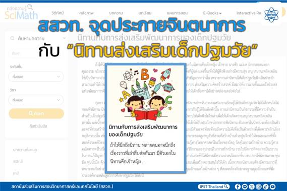EZ Webmaster March 14, 2025 EZ Webmaster March 14, 2025 สสวท. จุดประกายจินตนาการกับ “นิทานส่งเสริมเด็กปฐมวัย” สถาบันส่งเสริมการสอนวิทยาศาสตร์และเทคโนโลยี (สสวท.) จุดประกายความสำคัญของจินตนาการกับน้อง ๆ ปฐมวัยด้วย “นิทานกับการส่งเสริมพัฒนาการของเด็กปฐมวัย” เรียนรู้ประโยชน์ของการใช้นิทานเป็นสื่อพัฒนาจินตนาการ สอดแทรกคุณธรรม ส่งเสริมความคิดสร้างสรรค์และสมาธิที่ยาวนานขึ้นของเด็ก ๆ ทั้งยังส่งเสริมพัฒนาการด้านภาษา สร้างคุณค่าในการสื่อสาร บทความสร้างพลังบวกให้ผู้ปกครองและผู้สนใจ เติมเต็มความรอบรู้ได้ที่ คลังความรู้ SciMath สสวท. https://www.scimath.org/article-science/item/12350