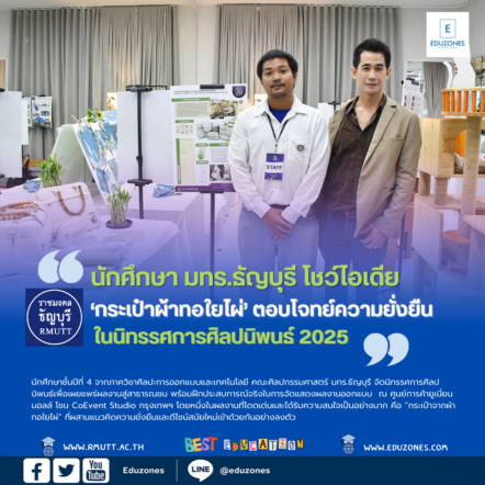 มทร.ธัญบุรี พร้อมปั้นบัณฑิตสู่ยุค NEXT GEN การันตีความสำเร็จด้วยคลื่นมหาชน tui sakrapeeDecember 4, 2025 มหาวิทยาลัยเทคโนโลยีราชมงคลธัญบุรี (มทร.ธัญบุรี) สร้างปรากฏการณ์ครั้งสำคัญในแวดวงการศึกษาไทยผ่านงาน ‘RMUTT NEXT GEN: Open House 2026 : เปิดประตูสู่ราชมงคลธัญบุรี 69’ เมื่อวันที่ 27 และ 28 พฤศจิกายน 2568… ม.กรุงเทพ จัดงาน The Shape of Tomorrow: Bangkok Art & Architecture @Dib Bangkok tui sakrapeeDecember 4, 2025 คณะสถาปัตยกรรมศาสตร์ มหาวิทยาลัยกรุงเทพ จัดงาน “The Shape of Tomorrow: Bangkok Art & Architecture” เปิดพื้นที่แลกเปลี่ยนองค์ความรู้และประสบการณ์ระหว่างนักวิชาการ ผู้เชี่ยวชาญในวงการสถาปัตยกรรมที่มุ่งเน้นแนวคิดการออกแบบที่ตอบโจทย์ความยั่งยืน (Sustainability) และการปรับใช้พื้นที่อาคารให้เกิดคุณค่าใหม่ (Adaptive Reuse) โดยปรับเปลี่ยนพื้นที่เดิมให้กลายเป็นพื้นที่สร้างสรรค์อย่าง… มหาวิทยาลัยราชภัฏสวนสุนันทา จับมือ “เอ็ม พาวเวอร์ คอร์ปอเรชั่น” ลงนาม MOU ขับเคลื่อนระบบจัดการวัสดุรีไซเคิล สู่มหาวิทยาลัยสีเขียวอย่างยั่งยืน tui sakrapeeDecember 4, 2025 เมื่อวันพฤหัสบดีที่ 4 ธันวาคม 2568 มหาวิทยาลัยราชภัฏสวนสุนันทา จัดพิธีลงนามบันทึกความเข้าใจ (MOU) ร่วมกับบริษัท เอ็ม พาวเวอร์ คอร์ปอเรชั่น จำกัด ณ ห้องประชุมสภามหาวิทยาลัย เพื่อขับเคลื่อนการพัฒนาระบบการจัดการวัสดุรีไซเคิลภายในมหาวิทยาลัยอย่างเป็นรูปธรรมและยั่งยืน พิธีลงนามในครั้งนี้มีวัตถุประสงค์เพื่อพัฒนากลไกการจัดการวัสดุรีไซเคิลให้มีประสิทธิภาพยิ่งขึ้น ส่งเสริมการคัดแยกขยะอย่างถูกต้อง เพิ่มคุณค่าและสร้างรายได้จากวัสดุที่สามารถนำกลับมาใช้ใหม่… สุดเจ๋ง! สถานศึกษาอาชีวะ รับรางวัลโครงการชีววิถีฯ ระดับประเทศ ประจำปี 2568 สานต่อปณิธานหลักปรัชญาเศรษฐกิจพอเพียงของพ่อหลวงรัชกาลที่ 9 EZ WebmasterDecember 3, 2025 สุดเจ๋ง! สถานศึกษาอาชีวะ รับรางวัลโครงการชีววิถีฯ ระดับประเทศ ประจำปี 2568 สานต่อปณิธานหลักปรัชญาเศรษฐกิจพอเพียงของพ่อหลวงรัชกาลที่ 9 วันนี้ (1 ธ.ค. 68) นายยศพล เวณุโกเศศ เลขาธิการคณะกรรมการการอาชีวศึกษา มอบหมายให้ นายสง่า แต่เชื้อสาย… Search for: Search Month: March 2025 tui sakrapee March 20, 2025 นักศึกษา มทร.ธัญบุรี โชว์ไอเดีย “กระเป๋าผ้าทอใยไผ่” ตอบโจทย์ความยั่งยืน ในนิทรรศการศิลปนิพนธ์ 2025 tui sakrapee March 20, 2025 นักศึกษาชั้นปีที่ 4 จากภาควิชาศิลปะการออกแบบและเทคโนโลยี คณะศิลปกรรมศาสตร์ มหาวิทยาลัยเทคโนโลยีราชมงคลธัญบุรี (มทร.ธัญบุรี) ได้ร่วมกันจัดนิทรรศการศิลปนิพนธ์เพื่อเผยแพร่ผลงานสู่สาธารณชน พร้อมฝึกประสบการณ์จริงในการจัดแสดงผลงานออกแบบ ภายในงานได้รวบรวมผลงานจาก 4 สาขาวิชา ได้แก่ ออกแบบนิเทศศิลป์ ออกแบบภายใน ออกแบบผลิตภัณฑ์ และนวัตกรรมการออกแบบผลิตภัณฑ์ร่วมสมัย จัดขึ