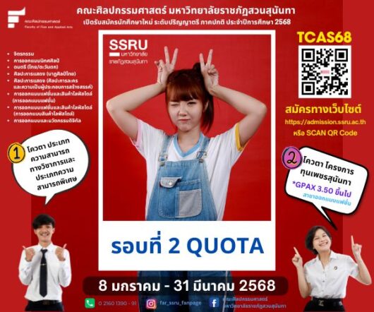 tui sakrapee March 17, 2025 โควตาโค้งสุดท้าย! ศิลปกรรมศาสตร์ สวนสุนันทา รับสมัครเรียนต่อ รอบ 2 ความสามารถพิเศษ พร้อมโครงการทุนเพชรสุนันทา เรียนสาขาออกแบบแฟชั่น tui sakrapee March 17, 2025 เปิดรับสมัครต่อ.. #เด็ก68 รอบนี้เป็นโควตาความสามารถพิเศษ และมีทุนเพชรสุนันทา (สาขาออกแบบแฟชั่น) คณะศิลปกรรมศาสตร์ มหาวิทยาลัยราชภัฏสวนสุนันทา เปิดรับสมัครนักศึกษาใหม่ ระดับปริญญาตรี (ภาคปกติ) ปีการศึกษา 2568 《 รอบ 2 Quota 》 เปิดรับสมัครวันที่ 8 มกราคม – 31 มีนาคม 2568 สมัครออนไลน์ที่ https://admission.ssru.ac.th/ ระเบียบการรับสมัคร – โควตาวิชาการและความสามารถพิเศษ https://cts.ssru.ac.th/File/IS/Announce/Files/ijfckfov.pdf – โควตา… Continue Reading
