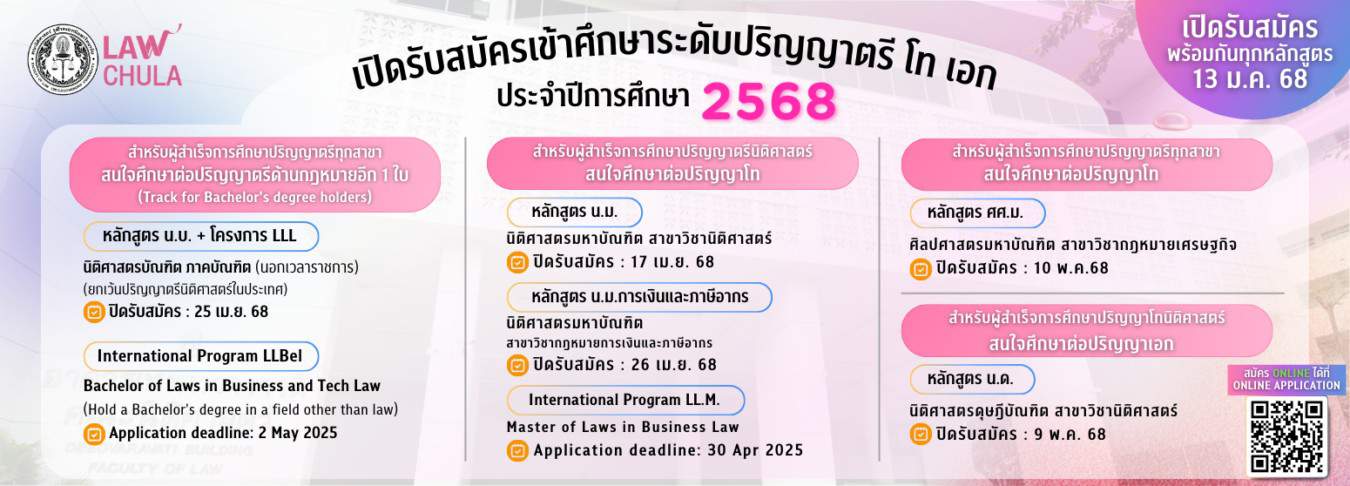 EZ Webmaster April 21, 2025 EZ Webmaster April 21, 2025 คณะนิติศาสตร์ จุฬาฯ เปิดรับสมัครรอบตรง ปี 2568 ไม่ใช้คะแนนสอบกลาง! คณะนิติศาสตร์ จุฬาลงกรณ์มหาวิทยาลัย เปิดรับสมัครบุคคลเข้าศึกษาต่อในหลากหลายหลักสูตร ครอบคลุมทั้งระดับปริญญาตรี ภาคนอกเวลาราชการ หลักสูตรนานาชาติ ระดับปริญญาโท และระดับปริญญาเอก สำหรับปีการศึกษา 2568 โดยมีรายละเอียดดังนี้ หลักสูตรจัดการเรียนการสอนเป็นภาษาไทย •หลักสูตร น.บ. (นิติศาสตรบัณฑิต ภาคบัณฑิต (นอกเวลาราชการ)) และโครงการ Life Long Learning คู่ขนานต่อยอด น.บ. ภาคบัณฑิตฯ •หลักสูตร น.ม. (นิติศาสตรมหาบัณฑิต สาขาวิชานิติศาสตร์) •หลักสูตร น.ม.การเงิน (นิติศาสตรมหาบัณฑิต สาขาวิชากฎหมายการเงินและภาษีอากร) •หลักสูตร ศศ.ม. (ศิลปศาสตรมหาบัณฑิต สาขาวิชากฎหมายเศรษฐกิจ) •หลักสูตร น.ด. (นิติศาสตรดุษฎีบัณฑิต สาขาวิชานิติศาสตร์) หลักสูตรจัดการเรียนการสอนเป็นภาษาอังกฤษ (Programs taught in English) •LLBel, Bachelor of Laws in Business and Technology Law (Track for Bachelor’s degree holders) •LL.M., Master of Laws in Business Law ระยะเวลารับสมัคร หลักสูตรปริญญาตรีภาคนอกเวลาราชการ: เปิดรับสมัครตั้งแต่บัดนี้ ถึงวันที่ 25 เมษายน 2568 หลักสูตรนานาชาติ (Business and Tech Law): เปิดรับสมัครถึงวันที่ 2 พฤษภาคม 2568 ระบบ TCAS รอบที่ 3: เปิดรับสมัครระหว่างวันที่ 6 – 12 พฤษภาคม 2568 ระดับปริญญาโท สาขาการเงินและภาษีอากร: สมัครได้ถึงวันที่ 26 เมษายน 2568 ระดับปริญญาโท หลักสูตรนานาชาติ: สมัครได้ถึงวันที่ 30 เมษายน 2568 หลักสูตรศิลปศาสตรมหาบัณฑิต สาขากฎหมายเศรษฐกิจ: เปิดรับสมัครถึงวันที่ 10 พฤษภาคม 2568 ระดับปริญญาเอก: เปิดรับสมัครถึงวันที่ 9 พฤษภาคม 2568 ผู้สนใจสามารถศึกษารายละเอียดเพิ่มเติมและสมัครได้ภายในช่วงเวลาที่กำหนด สอบถามข้อมูลเพิ่มเติมหรือติดตามข่าวสารการรับสมัครได้ทางเว็บไซต์ของคณะ หรือช่องทางประชาสัมพันธ์อย่างเป็นทางการ https://law.chula-regist.com