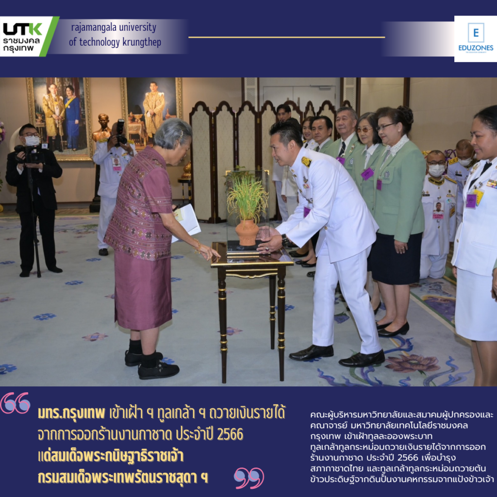 tui sakrapee May 2, 2025 tui sakrapee May 2, 2025 มทร.กรุงเทพ เข้าเฝ้าฯ ทูลเกล้าฯ ถวายเงินรายได้จากการออกร้านงานกาชาด ประจำปี 2566 แด่สมเด็จพระกนิษฐาธิราชเจ้า กรมสมเด็จพระเทพรัตนราชสุดา ฯ เพื่อสมทบทุนสภากาชาดไทย มทร.กรุงเทพ เข้าเฝ้า ฯ ทูลเกล้า ฯ ถวายเงินรายได้จากการออกร้านงานกาชาด ประจำปี 2566 แด่สมเด็จพระกนิษฐาธิราชเจ้า กรมสมเด็จพระเทพรัตนราชสุดา ฯ เพื่อสมทบทุนสภากาชาดไทย เมื่อวันที่ 1 พฤษภาคม 2568 ณ วังสระปทุม สมเด็จพระกนิษฐาธิราชเจ้า กรมสมเด็จพระเทพรัตนราชสุดา ฯ สยามบรมราชกุมารี พระราชทานพระราชวโรกาสให้ ศาสตราจารย์กิตติคุณสุจิระ ขอจิตต์เมตต์ กรรมการสภามหาวิทยาลัยเทคโนโลยีราชมงคลกรุงเทพ ผู้ทรงคุณวุฒิ พร้อมด้วยคณะผู้บริหารมหาวิทยาลัยและสมาคมผู้ปกครองและคณาจารย์ มหาวิทยาลัยเทคโนโลยีราชมงคลกรุงเทพ เข้าเฝ้าทูลละอองพระบาท ทูลเกล้าทูลกระหม่อมถวายเงินรายได้จากการออกร้านงานกาชาด ประจำปี 2566 เพื่อบำรุงสภากาชาดไทย และทูลเกล้าทูลกระหม่อมถวายต้นข้าวประดิษฐ์จากดินปั้นงานคหกรรมจากแป้งข้าวเจ้า ซึ่งเป็นผลงานจากอาจารย์คณะเทคโนโลยีคหกรรมศาสตร์ ที่ได้รับรางวัลชนะเลิศโล่พระราชทานสมเด็จพระกนิษฐาธิราชเจ้า กรมสมเด็จพระเทพรัตนราชสุดา ฯ สยามบรมราชกุมารี จากการประกวดนวัตกรรมข้าวไทย ประจำปี 2567 .