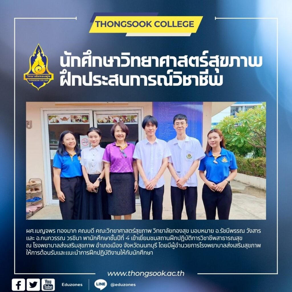 tui sakrapee May 3, 2025 tui sakrapee May 3, 2025 นักศึกษาวิทยาศาสตร์สุขภาพ วิทยาลัยทองสุข เข้าฝึกประสบการณ์วิชาชีพสาธารณสุข : เปิดรับทุกระดับป.ตรี-ป.เอก วันนี้ เริ่มเรียนมิ.ย.68 ผู้ช่วยศาสตราจารย์เบญจพร ทองมาก คณบดี คณะวิทยาศาสตร์สุขภาพมอบหมาย อาจารย์รัชนีพรรณ วังสาร และ อาจารย์กนกวรรณ วรชินา พานักศึกษาชั้นปีที่ 4 เข้าเยี่ยมชมสถานฝึกปฏิบัติการวิชาชีพสาธารณสุข ณ โรงพยาบาลส่งเสริมสุขภาพ อำเภอเมือง จังหวัดนนทบุรี โดยมีผู้อำนวยการโรงพยาบาลส่งเสริมสุขภาพ ให้การต้อนรับและแนะนำการฝึกปฏิบัติงานให้กับนักศึกษา การฝึกประสบการณ์ด้านสาธารณสุขในพื้นที่โรงพยาบาลส่งเสริมสุขภาพตำบล เพื่อการฝึกประสบการณ์ด้านสาธารณสุข ของนักศึกษาชั้นปีที่ 4 ในพื้นที่ รพ.สต. โดยเน้นการเริ่มต้น ประสบการณ์จิตอาสานำสู่เข้าวิชาชีพทางด้านวิทยาศาสตร์สุขภาพ เพื่อให้นักศึกษาชั้นปีที่ 4 หลักสูตรสาธารณสุขศาสตรบัณฑิต คณะวิทยาศาสตร์สุขภาพ วิทยาลัยทองสุข ได้นำประสบการณ์ที่เรียนรู้จาก รพ.สต. มาประยุกต์ใช้ในการจัดการเรียนการสอนในรายวิชาด้านสาธารณสุข ดังนั้นการฝึกประสบการณ์การเรียนรู้ด้านสาธารณสุข โดยมีแหล่งฝึกปฏิบัติงานโรงพยาบาลส่งเสริมสุขภาพตำบล และศูนย์บริการสุขภาพชุมชน ซึ่งเป็นแหล่งเรียนรู้ที่ผู้เรียน จะได้ทักษะความรู้ ความสามารถ ในการปฏิบัติงานตามบทบาทหน้าที่ในเรื่อง การส่งเสริมสุขภาพ การ รักษาพยาบาล การควบคุมป้องกันโรค การฟื้นฟูสภาพผู้ป่วย และอื่นๆ ตามบริบทของสาขาวิชา และรับรู้ในการ แก้ไขปัญหางานสาธารณสุขได้อย่างมีประสิทธิภาพ ตลอดจนมีเจตคติที่ดีต่อวิชาชีพ วิทยาลัยทองสุขเปิดรับสมัครนักศึกษาใหม่ ปีการศึกษษ 2568 รับสมัครนักศึกษาใหม่ ปี 2568 ภาคเรียนที่ 1 เริ่มเรียน มิถุนายน 2568 #ระดับปริญญาตรี หลักสูตรบริหารธุรกิจบัณฑิต B.B.A. สาขาวิชาการจัดการ 4 ปี สาขาวิชาการจัดการ 2 ปีต่อเนื่อง หลักสูตรบัญชีบัณฑิต B.Ac หลักสูตรรัฐประศาสนศาสตรบัณฑิต B.P.A. หลักสูตรนิติศาสตรบัณฑิต LL.B. หลักสูตรสาธารณสุขศาสตรบัณฑิต B.P.H. INTERNATIONAL PROGRAM -B.A. in TESOL -B.B.A. in Management #ระดับปริญญาโท หลักสูตรบริหารธุรกิจมหาบัณฑิต M.B.A รัฐประศาสนศาสตรมหาบัณฑิต M.P.A. ศึกษาศาสตรมหาบัณฑิต M.Ed. -สาขาวิชาบริหารการศึกษา -สาขาวิชาสังคม ศาสนา และวัฒนธรรม English Program M.Ed. Master in Educational Administration #ระดับปริญญาเอก หลักสูตรปรัชญาดุษฎีบัณฑิต Ph.D. สาขาวิชาบริหารธุรกิจ สาขาวิชาการบริหารการศึกษา ภาพ : วิทยาลัยทองสุข สอบถามเพิ่มเติม ผศ.สรียา ศศะรมย์ 0831987789 อ.อธิพงษ์ คิดดี 0994454433 ผศ.ธรรศพงศ์ วงษ์สวัสดิ์ 0959192545
