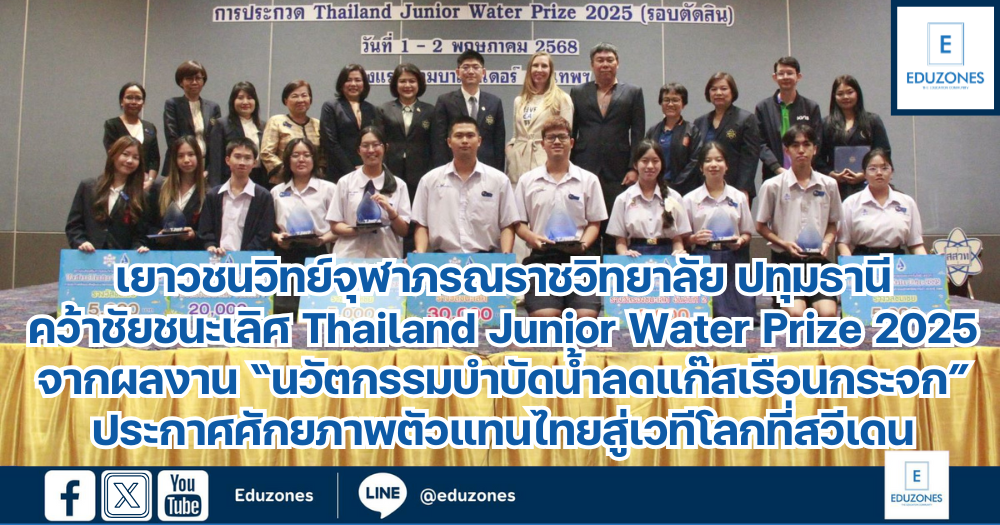 EZ Webmaster May 7, 2025 EZ Webmaster May 7, 2025 เยาวชนวิทย์จุฬาภรณราชวิทยาลัย ปทุมธานี คว้าชัยชนะเลิศ Thailand Junior Water Prize 2025 จาก ผลงาน “นวัตกรรมบำบัดน้ำลดแก๊สเรือนกระจก” ประกาศศักยภาพตัวแทนไทยสู่เวทีโลกที่สวีเดน รศ.ดร.ธีระเดช เจียรสุขสกุล ผู้อำนวยการสถาบันส่งเสริมการสอนวิทยาศาสตร์และเทคโนโลยี (สสวท.) เป็นประธานในพิธีประกาศผลและมอบรางวัลการประกวด Thailand Junior Water Prize 2025 โดยมี Ms. Lina Eidmark Counsellor จากสถานเอกอัครราชทูตสวีเดนประจำประเทศไทย ดร.กุศลิน มุสิกุล ผู้ช่วยผู้อำนวยการ สสวท. และดร.เขมวดี พงศานนท์ ผู้อำนวยการฝ่ายพัฒนาครูและบุคลากรทางการศึกษา สสวท. ร่วมในพิธีมอบรางวัล พร้อมทั้งเยาวชนระดับมัธยมศึกษาจากทั่วประเทศที่เข้าร่วมแข่งขันนำเสนองานวิจัยและนวัตกรรมด้านการจัดการทรัพยากรน้ำและสิ่งแวดล้อมกว่า 36 ทีม ซึ่งจัดขึ้นระหว่างวันที่ 1-2 พฤษภาคม 2568 ณ ห้อง Convention AB ชั้น 1 โรงแรมแอมบาสซาเดอร์ กรุงเทพฯ การประกวดครั้งนี้มีคณะกรรมการผู้ทรงคุณวุฒิร่วมพิจารณาผลงานจากการนำเสนอแบบโปสเตอร์และการสัมภาษณ์เชิงลึก ผลปรากฎว่า ดังนี้ รางวัลชนะเลิศปีนี้เป็นของ นายณัฐพัชร์ รอดทอง และนายพีรธาดา สิทธิเกรียงไกร โรงเรียนวิทยาศาสตร์จุฬาภรณราชวิทยาลัย ปทุมธานี จากผลงานวิจัย paPECo : การเพิ่มศักยภาพการบำบัดน้ำและลดการปลดปล่อยแก๊สเรือนกระจกจากอุตสาหกรรมผลิตกระดาษ ด้วยระบบกำจัดสารประกอบฟีนอล ที่พัฒนาจากขั้วไฟฟ้า FTO/WO₃/BiVO₄ร่วมกับเทคนิคโฟโตอิเล็กโตรคะตะไลติก คว้ารางวัลโล่ เกียรติบัตร และเงินรางวัล พร้อมเป็นตัวแทนประเทศไทยเข้าร่วมการแข่งขันเวทีระดับนานาชาติ Stockholm Junior Water Prize 2025 ที่ประเทศสวีเดน รองชนะเลิศอันดับ 1 ได้แก่ นายชญาณ์ชนญ์ เจียมเวชวิทยาภร และนางสาววรินทิพย์ สุวรรณรัศมี โรงเรียนกำเนิดวิทย์ จ.ระยอง จากผลงาน การบำบัดมลพิษสีย้อมเอโซและแอนทราควิโนน ด้วยบีดเซลลูโลส-อัลจิเนต-ซีโอไลต์ ร่วมกับการย่อยสลายทางชีวภาพ รองชนะเลิศอันดับ 2 ได้แก่ นางสาวปภาดา ปฐมเนติกุล และนางสาวณัฐณิชา คำวัง โรงเรียนมงฟอร์ตวิทยาลัย จ.เชียงใหม่ จากผลงาน การพัฒนาอุปกรณ์ต้นแบบแยกไมโครพลาสติกจากแหล่งน้ำ ด้วยสารละลาย Superparamagnetic น้ำมันเมล็ดมะแตก รางวัลชมเชย 3 รางวัล ได้แก่ ผลงาน Biomimetic Cocoon; นวัตกรรมรักษาความชื้นในดิน จากโรงเรียนพนมสารคาม “พนมอดุลวิทยา” ผลงาน เม็ดบีดส์คอมโพสิตจากแบคทีเรียเซลลูโลส/โซเดียมแอลจิเนต จากโรงเรียนนานาชาติคิงส์คอลเลจ กรุงเทพ ผลงาน การพัฒนาคุณภาพน้ำเสียจากโรงงานน้ำมันปาล์ม จากโรงเรียนสาธิตแห่งมหาวิทยาลัยเกษตรศาสตร์ ศูนย์วิจัยและพัฒนาการศึกษา การแข่งขัน Thailand Junior Water Prize จัดขึ้นต่อเนื่องทุกปี เพื่อส