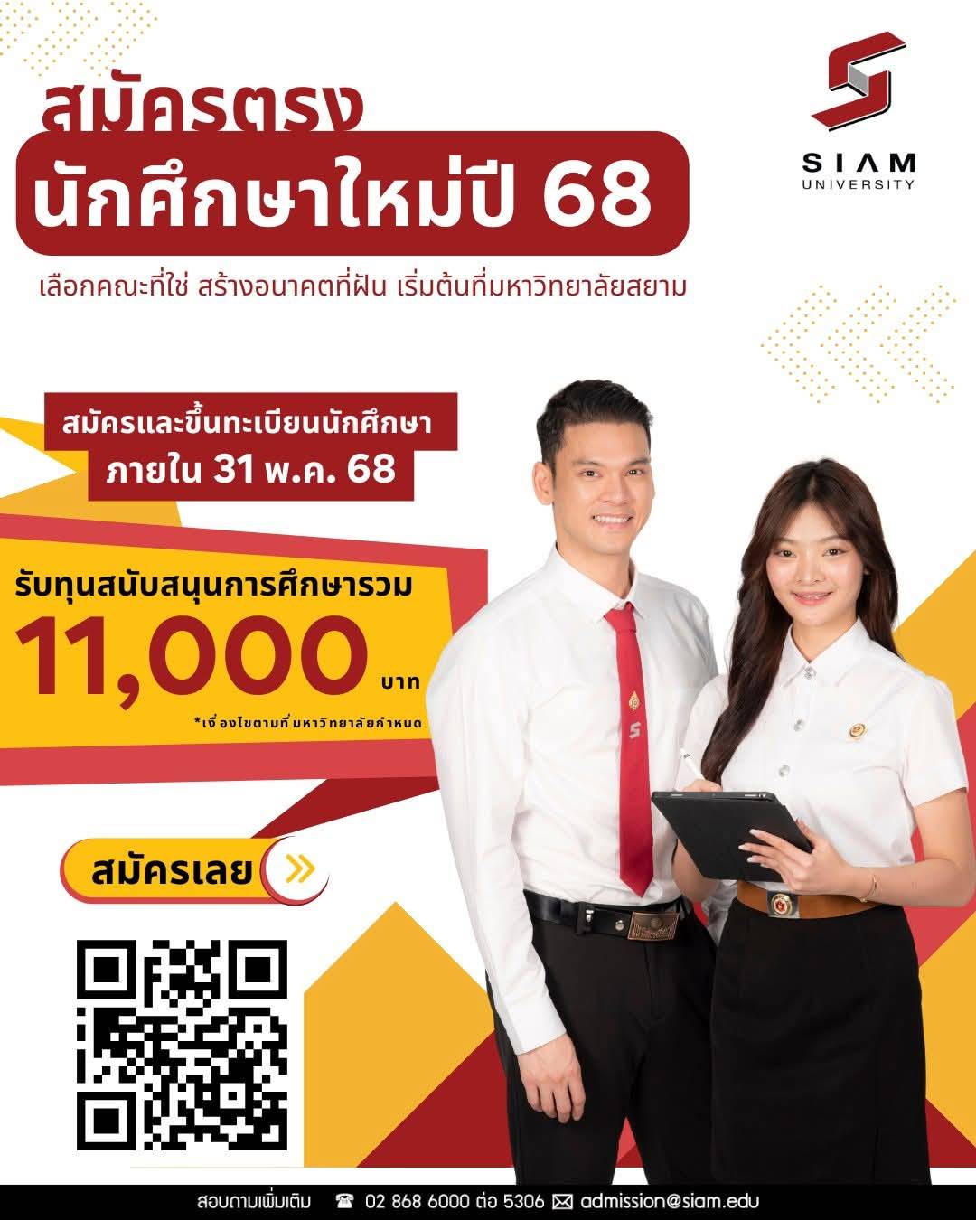 EZ Webmaster May 16, 2025 EZ Webmaster May 16, 2025 สมัครเรียนที่ “มหาวิทยาลัยสยาม” รับทุนสนับสนุนการศึกษารวม 11,000 บาท สมัครเรียนตรงที่ “มหาวิทยาลัยสยาม” วันนี้! รับทุนสนับสนุนการศึกษารวม 11,000 บาท **เงื่อนไขตามที่มหาวิทยาลัยกำหนด สมัครเลย : https://apply.siam.edu/ ข้อมูล คณะสาขา : https://admission.siam.edu/e-brochure/ หรือสอบถามข้อมูลเพิ่มเติม: inbox / โทร. 02-868-6000 ต่อ 5306 #มหาวิทยาลัยสยาม #SiamUniversity #สมัครตรง #ทุนการศึกษา