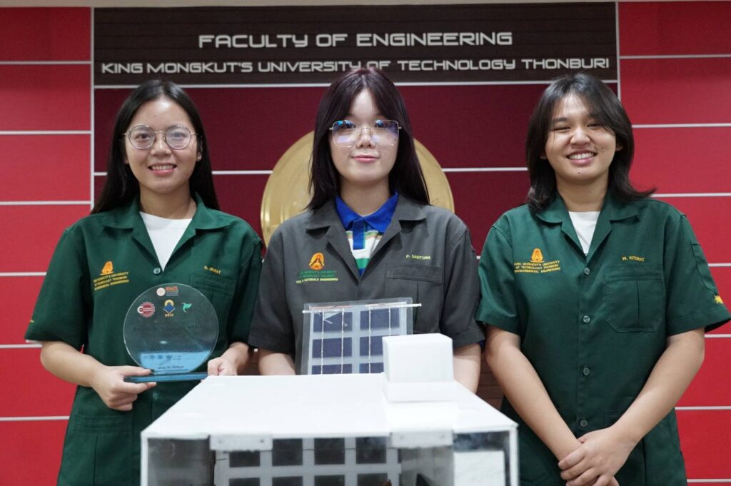 EZ Webmaster May 22, 2025 EZ Webmaster May 22, 2025 “Smart Film ฟิล์มอัจฉริยะ” ฝีมือนักศึกษา มจธ. ปรับแสงได้-ผลิตพลังงานเอง แก้ปัญหาบ้านร้อนอย่างยั่งยืน ในวันที่โลกกำลังเผชิญกับวิกฤตพลังงานและการเปลี่ยนแปลงสภาพภูมิอากาศ ซึ่งการแก้ปัญหานั้นพลังของคนรุ่นใหม่ที่เต็มไปด้วยความคิดสร้างสรรค์สำคัญอย่างยิ่งต่อการสร้างนวัตกรรมเพื่อโลก เช่นเดียวกับนวัตกรรมของนักศึกษาจากมหาวิทยาลัยเทคโนโลยีพระจอมเกล้าธนบุรี (มจธ.) อย่างผลงานวิจัยต้นแบบ “ฟิล์มจัดการพลังงานปรับความสว่างภายในอาคารที่ผลิตพลังงานได้ด้วยตัวเอง” หรือ “ฟิล์มอัจฉริยะ” ที่สามารถปรับระดับความโปร่งใสของฟิล์มให้เหมาะกับความสว่างของห้องได้เอง พร้อมใช้แสงอาทิตย์ในการผลิตกระแสไฟฟ้า เพื่อหล่อเลี้ยงระบบได้เอง เป็นแนวทางใหม่ที่ตอบโจทย์การใช้พลังงานในอาคารยุคใหม่ ที่ต้องการทั้งความยั่งยืน ความสวยงาม และความสะดวกสบายในการใช้งาน นวัตกรรมนี้คิดค้นโดยทีม “Power Maker” ซึ่งประกอบด้วย 3 นักศึกษาคณะวิศวกรรมศาสตร์ ประกอบด้วย จิรารัตน์ งานรุ่งเรือง, ภัชรพร ชัยแก้ว จากภาควิชาวิศวกรรมสิ่งแวดล้อม และ ศศิธรณ์ พิกุลแก้ว จากภาควิชาวิศวกรรมเครื่องมือและวัสดุ โดยมี รศ. ดร.สุรวุฒิ ช่วงโชติ อาจารย์ประจำภาควิชาวิศวกรรมเครื่องมือและวัสดุ คณะวิศวกรรมศาสตร์ และ รศ. ดร.ภาติญา เขมาชีวะกุล อาจารย์ประจำภาควิชาวิศวกรรมสิ่งแวดล้อม คณะวิศวกรรมศาสตร์ เป็นอาจารย์ที่ปรึกษา “จุดเริ่มต้นเกิดจากการที่พวกเราสังเกตเห็นปัญหาการใช้พลังงานในอาคารที่มีกระจกเป็นวัสดุหลัก อย่าง อาคารสำนักงานหรือมหาวิทยาลัย ที่มักมีปัญหาแสงแดดส่องเข้ามามากเกินไปจนต้องปิดม่านบังแสงและเปิดไฟในเวลากลางวัน หรือเปิดแอร์ให้แรงขึ้นเพื่อจัดการกับความร้อนภายนอก ซึ่งพวกเรามองว่าเรื่องนี้เป็นการใช้พลังงานอย่างไม่คุ้มค่า ทั้งที่แสงแดดนั้นสามารถเป็นแหล่งพลังงานได้หากได้รับการจัดการอย่างมีประสิทธิภาพ จึงนำปัญหาเหล่านี้ไปปรึกษาที่ปรึกษาในกลุ่มวิจัย Research Center of Advanced Materials for Energy and Environmental Technology (MEET)” จิรารัตน์ ตัวแทนทีมกล่าวถึงจุดเริ่มต้นของโครงการ โดยนวัตกรรมนี้เป็นการผสานสองเทคโนโลยีสำคัญเข้าด้วยกัน ได้แก่ “ฟิล์มอิเล็กโทรโครมิก (Electrochromic Film)” ที่สามารถควบคุมความโปร่งใสของฟิล์มได้ตามการจ่ายไฟฟ้า ที่ไปกระตุ้นการจัดเรียงโครงสร้างผลึกในวัสดุ และ “เซลล์แสงอาทิตย์ (Solar Cell)” ที่ถูกผนึกอยู่ในแผ่นฟิล์มที่สามารถเปลี่ยนพลังงานแสงที่ตกกระทบให้กลายเป็นพลังงานไฟฟ้าเพื่อนำไปใช้ในระบบได้ทันที ฟิล์มนี้ช่วยควบคุมปริมาณแสงที่ผ่านเข้ามาในห้อง ทำให้ลดความร้