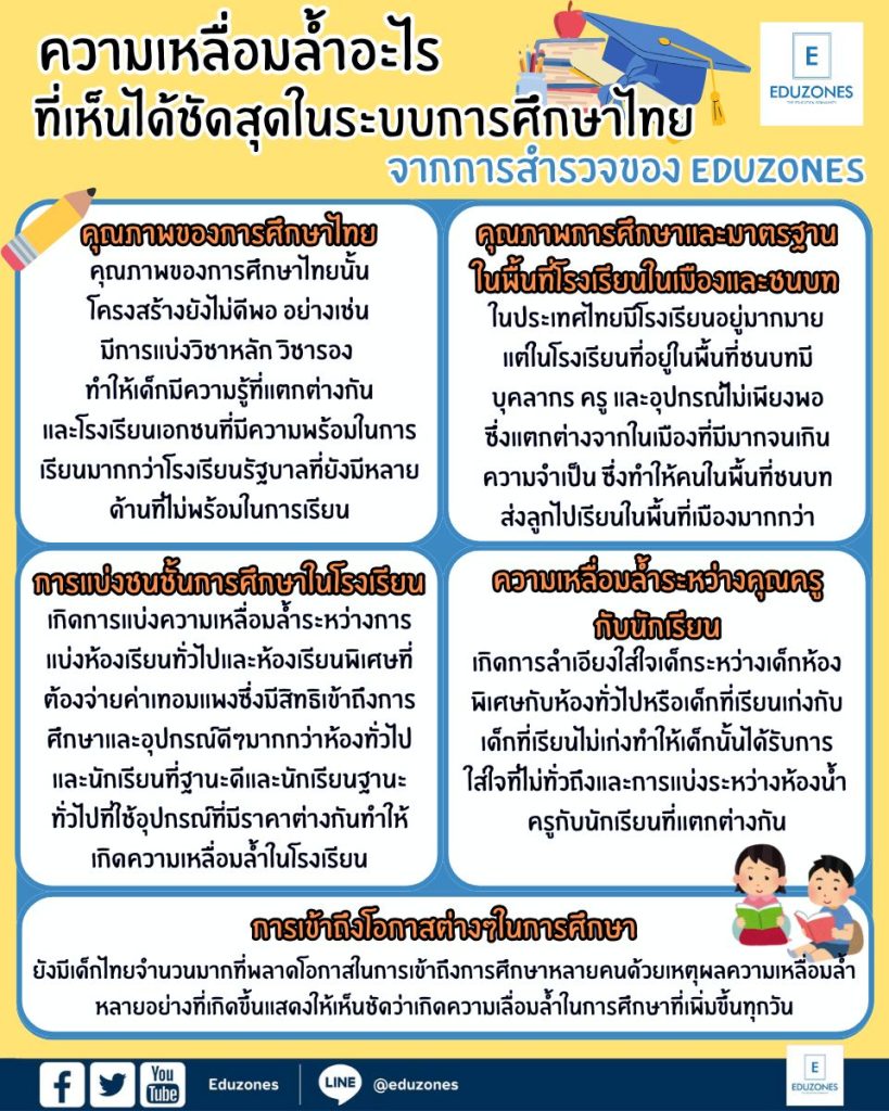 EZ Webmaster May 30, 2025 EZ Webmaster May 30, 2025 ความเหลื่อมล้ำอะไรที่เห็นได้ชัดสุดในระบบการศึกษาไทย จากการสำรวจของ EDUZONES การศึกษาไทยนั้นเป็นระบบที่อยู่คู่กับสังคมชาวไทยมานานและเป็นสิ่งสำคัญที่จะทำให้ประเทศไทยนั้นก้าวหน้าแต่การศึกษาไทยนั้นก็ถือว่ามีความพัฒนาล้าช้าอยู่มากซึ่งอยู่ที่อันดับ 107 ของโลกซึ่งเป็นอันดับที่ต่ำกว่าประเทศเพื่อนบ้านเราอย่างประเทศลาวและอยู่ในอับดับที่ 8 ของในกลุ่มอาเซียนก็แสดงชี้ชัดให้เห็นว่าการศึกษาไทยนั้นพัฒนาได้ล่าช้ากว่าหลายประเทศและหนึ่งปัจจัยที่ทำให้การศึกษาไทยเป็นแบบนี้ก็ไม่พ้นความเหลือมล้ำในการศึกษาไทย วันนี้เราได้รวบรวมความคิดเห็นของผู้คนในชุมชนของ Eduzones ในหัวข้อ “ความเหลื่อมล้ำอะไรที่เห็นได้ชัดสุดในระบบการศึกษาไทย” โดยเก็บข้อมูลในวันที่ 22 กันยายน 2566 รวบรวมความคิดเห็นนำมาสรุปเป็น 5 หัวข้อดังนี้ 1.คุณภาพของการศึกษาไทย แน่นอนว่าหัวข้อแรกต้องเป็นเรื่องของคุณภาพของการศึกษาไทยที่ยังมีโครงสร้างที่ยังไม่ดีพอด้วย อย่างเช่น การมีวิชาหลัก วิชารองและวิชาที่ไม่จำเป็น ซึ่งสิ่งเหล่านี้เป็นการแบ่งแยกให้เด็กได้ความรู้ที่แตกต่างกันเพราะทุกวิชานั้นสำคัญเท่ากันทั้งหมดและควรมีวิชาที่จำเป็นต่อชีวิตประจำวันและอีกอย่างหนึ่งก็คือเรื่องของระบบการศึกษาระหว่างโรงเรียนรัฐบาลและโรงเรียนเอกชนซึ่งมีความแตกต่างอย่างสิ้นเชิงซึ่งโรงเรียนเอกชนจะมีการศึกษาที่เพรียบพร้อมกว่าในหลายด้านแต่โรงเรียนรัฐบาลยังมีปัญหาหลายอย่างในหลายโรงเรียนซึ่งเกิดความเหลื่อมล้ำของระหว่างประเภทของโรงเรียนในการศึกษาไทย 2.คุณภาพการศึกษาและมาตรฐานในพื้นที่โรงเรียนในเมืองและชนบท ในหัวข้อนี้เป็นหนึ่งในหัวข้อที่มองเห็นความเหลือมล้ำได้มากที่สุดเช่นกันก็คือคุณภาพการศึกษาระหว่างโรงเรียนในเมืองกับในชนบทโดยที่โรงเรียนในประเทศไทยมีประมาณ 29,583 แห่ง ซึ่งมีแบ่งประเภทโรงเรียนมี 4 ขนาดหลัก ได้แก่ โรงเรียนขนาดเล็ก,ขนาดกลาง,ขนาดใหญ่และขนาดใหญ่พิเศษ จากที่ได้สังเกตส่วนใหญ่โรงเรียนขนาดเล็กและขนาดกลางในตามตำบลหรืออำเภอต่างๆในต่างจังหวัดนั้นขาดแคลนคุณครู บุคลากรและอุปกรณ์ต่างๆในการศึกษาเป็นจำนวนมาก ซึ่งต่างจากโรงเรียนใหญ่และใหญ่พิเศษตามในตัวจังหวัดและในตัวกรุงเทพฯที่มีอุปกรณ์เหล่านี้มากมายมายเกินจำเป็น ซึ่งหัวข้อนี้สังเกตุได้จากที่พ่อแม่ผู้ปกครองที่อยู่ตามชนบทในอำเภอต่างๆที่อยากจะให้ลูกตัวเองมีการศึกษาที่ดีๆจึงเลือกส่งลูกตัวเองไปเรียนในโรงเรียนในตัวเมือง ตัวจังหวัดที่มีสภาพโรงเรียนที่ดีกว่