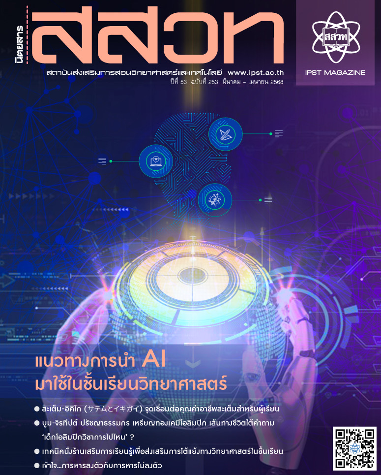 EZ Webmaster June 4, 2025 EZ Webmaster June 4, 2025 อ่านทันยุค สนุกได้ใจ อ่านฟรีรับเปิดเทอมใหม่ “นิตยสาร สสวท.” สถาบันส่งเสริมการสอนวิทยาศาสตร์และเทคโนโลยี (สสวท.) ชวนคุณครูและน้องๆเยาวชนอ่านรอบรู้กับนิตยสาร สสวท. ฉบับล่าสุด พบกับเรื่องน่ารู้คู่เปิดเทอมใหม่ “แนวทางการนำ AI มาใช้ในชั้นเรียนวิทยาศาสตร์” พบกับเรื่องเด่น “สะเต็ม-อิคิไก จุดเชื่อมต่อคุณค่าอาชีพสะเต็มสำหรับผู้เรียน” จากนั้นเรียนรู้ “เทคนิคนั่งร้านเสริมการเรียนรู้เพื่อส่งเสริมการโต้แย้งทางวิทยาศาสตร์ในชั้นเรียน” นาทีนี้ฟิสิกส์มีคำตอบด้วยความรู้เรื่อง “การเลี้ยวโค้งบนถนนเอียง (Banking Turn) กับเหตุผลว่าทำไมถนนบางแห่งถึงอันตราย” จับเข่าคุยตะลุยประสบการณ์คนเก่งกับ “จิรทีปต์ ปรัชญาธรรมกร เหรียญทองเคมีโอลิมปิกกับเส้นทางชีวิตใต้คำถาม ‘เด็กโอลิมปิกวิชาการไปไหน ?’” สำหรับคุณครูพลาดไม่ได้กับ เว็บไซต์ช่วยสอนตัวช่วยแสนดีของคุณครูทันยุค พบกับเรื่องชวนรู้อีกหลากหลายอ่านฟรี ดีต่อใจ คลิกเลยที่นิตยสาร สสวท. ออนไลน์ https://emagazine.ipst.ac.th