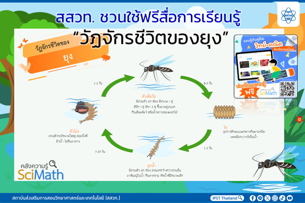 EZ Webmaster June 9, 2025 EZ Webmaster June 9, 2025 สสวท. ชวนใช้ฟรีสื่อการเรียนรู้ “วัฏจักรชีวิตของยุง” สถาบันส่งเสริมการสอนวิทยาศาสตร์และเทคโนโลยี (สสวท.) พาชั้นเรียนทำความเข้าใจกับสื่อการเรียนรู้ “วัฏจักรชีวิตของยุง” รู้จักลักษณะ และการเปลี่ยนแปลงของยุงตามระยะเวลาเป็นวงจรตั้งแต่ “ไข่ยุง” ใช้เวลา 1-3 วัน แล้วกลายเป็น “ลูกน้ำ” อาศัยกินสาหร่ายและพืชน้ำที่มีขนาดเล็กเป็นอาหาร เติบโตต่อไปจนเรียกว่า “ตัวโม่ง” ซึ่งมีส่วนหัวขนาดใหญ่และลอยนิ่ง ๆ ที่ผิวน้ำโดยไม่กินอาหาร ภายใน 1 – 3 วันก็จะเติบโตเป็น “ยุงเต็มวัย” กินเลือดสัตว์หรือน้ำหวานของดอกไม้เป็นอาหาร พบกับคลังภาพ “วัฏจักรชีวิตของยุง” คุณครูใช้เป็นสื่อการสอนหรือเสริมความรู้ก็สะดวก ดาวน์โหลดฟรีที่ คลังความรู้ SciMath สสวท. https://www.scimath.org/image-science/item/13072