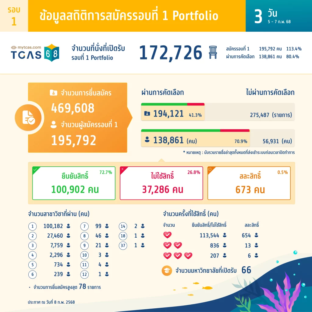 EZ Webmaster June 10, 2025 EZ Webmaster June 10, 2025 “เปิดสถิติ TCAS66-68 : รอบ 1-3 ใครสมัครเยอะ ใครได้ที่เรียนเยอะที่สุด และ 10 คณะฮิตไม่เปลี่ยน!” พี่ๆรวบรวมการเข้าสู่สนามสอบ TCAS69 น้อง ๆ หลายคนคงอยากรู้ว่า TCAS รอบ 1-3 ที่ผ่านมา มีแนวโน้มเป็นอย่างไร? รอบไหนสมัครเยอะ? ที่นั่งเหลือมากน้อยแค่ไหน? วันนี้เราสรุปเปรียบเทียบเฉลี่ย 3 ปีล่าสุด (66-68) ให้ชัด ๆ เพื่อเป็นแนวทางในการวางแผนสมัครรอบต่อไป TCAS66 (ปีการศึกษา 2566) รอบที่ 1 Portfolio จำนวนที่นั่งเปิดรับ : 171,047 ที่นั่ง จำนวนผู้สมัคร : 186,116 คน ผ่านการคัดเลือก : 135,922 คน ผู้ยืนยันสิทธิ์ : 97,401 คน ไม่ใช้สิทธิ์ : 38,521 คน สละสิทธิ์ : 645 คน จำนวนที่นั่งเหลือ : 61,853 ที่นั่ง รอบที่ 2 Quota จำนวนที่นั่งเปิดรับ : 122,807 ที่นั่ง จำนวนผู้สมัคร : 114,351 คน ผ่านการคัดเลือก : 61,920 คน ผู้ยืนยันสิทธิ์ : 45,366 คน ไม่ใช้สิทธิ์ : 16,554 คน สละสิทธิ์ : 614 คน จำนวนที่นั่งเหลือ : 76,953 ที่นั่ง รอบที่ 3 Admission จำนวนที่นั่งเปิดรับ : 154,627 ที่นั่ง จำนวนผู้สมัคร : 131,146 คน ผ่านการคัดเลือก : 105,456 คน ผู้ยืนยันสิทธิ์ : 76,583 คน ไม่ใช้สิทธิ์ : 28,873 คน สละสิทธิ์ : 791 คน จำนวนที่นั่งเหลือ : 56,209 ที่นั่ง รวมทั้ง 3 รอบในปี TCAS66 จำนวนผู้ยืนยันสิทธิ์รวม 3 รอบ : ≈ 219,350 คน ที่นั่งเหลือรวม 3 รอบ : ≈ 195,015 ที่นั่ง TCAS67 (ปีการศึกษา 2567) รอบที่ 1 Portfolio จำนวนที่นั่งเปิดรับ : 167,828 ที่นั่ง จำนวนผู้สมัคร : 187,268 คน ผ่านการคัดเลือก : 136,173 คน ผู้ยืนยันสิทธิ์ : 98,137 คน ไม่ใช้สิทธิ์ : 38,036 คน สละสิทธิ์ : 649 คน จำนวนที่นั่งเหลือ : 63,330 ที่นั่ง รอบที่ 2 Quota จำนวนที่นั่งเปิดรับ : 120,155 ที่นั่ง จำนวนผู้สมัคร : 112,606 คน ผ่านการคัดเลือก : 63,070 คน ผู้ยืนยันสิทธิ์ : 48,174 คน ไม่ใช้สิทธิ์ : 14,896 คน สละสิทธิ์ : 562 คน จำนวนที่นั่งเหลือ : 71,981 ที่นั่ง รอบที่ 3 Admission จำนวนที่นั่งเปิดรับ : 152,902 ที่นั่ง จำนวนผู้สมัคร : 129,842 คน ผ่านการคัดเลือก : 106,163 คน ผู้ยืนยันสิทธิ์ : 75,912 คน ไม่ใช้สิทธิ์ : 30,251 คน สละสิทธิ์ : 827 คน จำนวนที่นั่งเหลือ : 54,593 ที่นั่ง รวมทั้ง 3 รอบในปี TCAS67 จำนวนผู้ยืนยันสิทธิ์รวม 3 รอบ : ≈ 222,223 คน ที่นั่งเหลือรวม 3 รอบ : ≈ 189,904 ที่นั่ง TCAS68 (ปีการศึกษา 2568) รอบที่ 1 Portfolio จำนวนที่นั่งเปิดรับ : 172,726 ที่นั่ง จำนวนผู้สมัคร : 195,792 คน ผ่านการคัดเลือก : 138,861 คน ผู้ยืนยันสิทธิ์ : 100,902 คน ไม่ใช้สิทธิ์ : 37,959 คน สละสิทธิ์ : 604 คน จำนวนที่นั่งเหลือ : 62,943 ที่นั่ง รอบที่ 2 Quota จำนวนที่นั่งเปิดรับ : 125,674 ที่นั่ง จำนวนผู้สมัคร : 119,116 คน ผ่านการคัดเลือก : 67,436 คน ผู้ยืนยันสิทธิ์ : 50,590 คน ไม่ใช้สิทธิ์ : 16,846 คน สละสิทธิ์ : 553 คน จำนวนที่นั่งเหลือ : 75,084 ที่นั่ง รอบที่ 3 Admission จำนวนที่นั่งเปิดรับ : 153,926 ที่นั่ง จำนวนผู้สมัคร : 132,849 คน ผ่านการคัดเลือก : 105,711 คน ผู้ยืนยันสิทธิ์ : 79,479 คน ไม่ใช้สิทธิ์ : 4,514 คน สละสิทธิ์ : 3,002 คน จำนวนที่นั่งเหลือ : 53,370 ที่นั่ง รวมทั้ง 3 รอบในปี TCAS68 จำนวนผู้ยืนยันสิทธิ