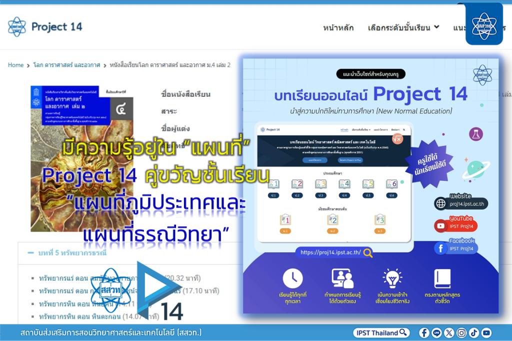 EZ Webmaster June 12, 2025 EZ Webmaster June 12, 2025 มีความรู้อยู่ใน “แผนที่” Project 14 คู่ขวัญชั้นเรียน “แผนที่ภูมิประเทศและแผนที่ธรณีวิทยา” สถาบันส่งเสริมการสอนวิทยาศาสตร์และเทคโนโลยี (สสวท.) พาเรียนรู้คู่ทักษะปฏิบัติวิทยาศาสตร์และเทคโนโลยี โลก ดาราศาสตร์และอวกาศ มัธยมศึกษาปีที่ 4 กับ บทเรียน “แผนที่ภูมิประเทศและแผนที่ธรณีวิทยา” เรียนรู้ข้อมูลในแผนที่ภูมิประเทศว่าอะไรคือ แผนที่ภูมิประเทศ และ เส้นชั้นความสูง รวมทั้งความหมายของสัญลักษณ์ต่าง ๆ เพื่อให้ผู้เรียนสามารถวิเคราะห์และอธิบายลักษณะภูมิประเทศของพื้นที่จากเส้นชั้นความสูงในแผนที่ภูมิประเทศได้ พร้อมแนะนำกิจกรรมสร้างความเข้าใจให้ชั้นเรียนด้วยอุปกรณ์ที่หาได้ง่าย เช่น ดินน้ำมัน น้ำ กล่องพลาสติก กระดาษ เป็นต้น คุณครูใช้เตรียมการสอนด้วยสื่อการเรียนรู้ฟรีที่ Project 14 สสวท. https://proj14.ipst.ac.th/m4-6-earth/m4-earth-book2