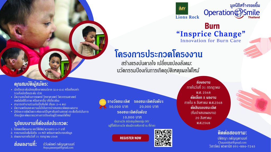 EZ Webmaster June 24, 2025 EZ Webmaster June 24, 2025 มูลนิธิสร้างรอยยิ้ม ชวนนักเรียนมัธยมปลาย ส่งผลงานประกวด “นวัตกรรมป้องกันการเกิดอุบัติเหตุแผลไหม้” ชิงรางวัลรวมกว่า 80,000 บาท มูลนิธิสร้างรอยยิ้ม (Operation Smile Thailand) ขอเชิญชวนนักเรียนระดับมัธยมศึกษาตอนปลายหรือเทียบเท่า ที่มีความสนใจด้านการแพทย์ วิทยาศาสตร์ วิศวกรรมศาสตร์ เทคโนโลยีชีวภาพ หรือสาขาอื่นๆ ที่เกี่ยวข้อง รวมทีมตั้งแต่ 2–4 คน ส่งผลงานเข้าร่วมประกวดในหัวข้อ “สร้างแรงบันดาลใจ เปลี่ยนแปลงสังคม: นวัตกรรมป้องกันการเกิดอุบัติเหตุแผลไหม้” ผู้บริหารมูลนิธิเผย การประกวดครั้งนี้ มุ่งเน้นการพัฒนาทักษะการคิดวิเคราะห์ การแก้ปัญหาเชิงสร้างสรรค์ และความกระตือรือร้นในการเรียนรู้ เพื่อสร้างแนวทางในการป้องกันการเกิดแผลไฟไหม้ในสังคมไทยอย่างยั่งยืน ทันตแพทย์หญิงยุพเรศ นิมกาญจน์ ประธานมูลนิธิสร้างรอยยิ้ม กล่าวถึงรายละเอียดของการประกวดครั้งนี้ว่า เป็นกิจกรรมที่สร้างการเรียนรู้เกี่ยวกับอุบัติเหตุแผลไหม้ซึ่งเกิดจากอุบัติเหตุทั้งน้ำร้อนลวก ไฟลวกและไฟฟ้า รวมทั้งแผลไหม้จากความเย็น เคมี กัมมันตภาพรังสี “ผู้ประสบอุบัติเหตุได้รับความทุกข์ทรมานจากแผลยึดติด หดรั้ง กลายเป็นคนพิการ ไม่สามารถดำรงชีวิตอย่างปกติได้ ที่ผ่านมา นอกจากช่วยเหลือผู้ป่วยอาการปากแหว่งเพดานโหว่แล้ว มูลนิธิฯ ได้ขยายไปสู่การผ่าตัดฟรีให้กับผู้ป่วยแผลไหม้อีกด้วย” “โครงการนี้ นอกจากเปิดโอกาสให้เยาวชนได้ตระหนักรู้เกี่ยวกับแผลไหม้แล้ว ยังเป็นการเชิญชวนให้เยาวชนได้เข้ามามีส่วนหนึ่งในการสร้างแรงบันดาลใจ เปลี่ยนแปลงสังคมเพื่อช่วยกันป้องกันการเกิดอุบัติเหตุแผลไหม้อย่างเป็นรูปธรรม” ประธานมูลนิธิสร้างรอยยิ้มกล่าว สำหรับคุณสมบัติและรูปแบบการส่งผลงานนั้น จะต้องกำลังศึกษาในระดับมัธยมศึกษาตอนปลาย หรือเทียบเท่ารวมทั้งนักเรียนระดับ ปวช. จัดตั้งทีมจำนวน 2–4 คน ส่ง โปสเตอร์นำเสนอแนวคิด และ วีดิทัศน์ความยาว 5–7 นาทีภายใต้แนวคิด “สร้างแรงบันดาลใจ เปลี่ยนแปลงสังคม : นวัตกรรมป้องกันการเกิดอุบัติเหตุแผลไหม้” แนบ รายงานฉบับเต็ม (ไม่เกิน 10 หน้า พร้อมภาพประกอบข้อมูล) กำหนดส่งผลงาน ภายในวันที่ 31 กรกฎาคม 2568 คณะกรรมการจะคัดเลือก 5 ผลงานภายในวันที่ 8 สิงหาคม 2568 และเชิญทีมที่ผ่านเข้ารอบสึดท้ายนำเสนอผลงานระหว่างวันที่ 14-15 สิงหาคม 2568 ผู้ชนะเลิศจะได้รับเงินรางวัล 50,000 บาท รองชนะเลิศอันดับหนึ่ง เงินรางวัล 20,000 บาท รองชนะเลิศอันดับสอง เงินรางวัล 10,000 บาท แบบฟอร์มรับสมัคร สอบถามรายละเอียดเพิ่มเติมได้ที่คุณปพิชญา กตัญญุตานนท์ Chayainkkat@gmail.com หรือติด