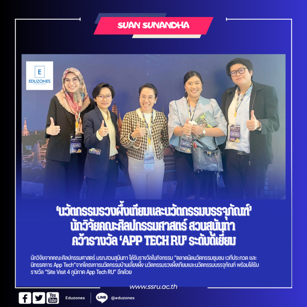 tui sakrapee June 28, 2025 tui sakrapee June 28, 2025 นักวิจัยคณะศิลปกรรมศาสตร์ สวนสุนันทา คว้ารางวัลนวัตกรรม “App Tech RU” ระดับดีเยี่ยม สถาบันวิจัยและพัฒนา มหาวิทยาลัยราชภัฏสวนสุนันทา นำทีมนักวิจัยเข้าร่วมกิจกรรม “ตลาดนัดนวัตกรรมชุมชน เวทีประกวด และนิทรรศการ App Tech” เครือข่ายมหาวิทยาลัยราชภัฏ 38 แห่งทั่วประเทศ ณ ลาน Outdoor Promotion ศูนย์การค้าเซ็นทรัล นครศรีธรรมราช เมื่อวันที่ 23 มิถุนายน 2568 โดยได้รับเกียรติจากผู้ว่าราชการจังหวัดนครศรีธรรมราชเป็นประธานกล่าวต้อนรับ และมีผู้ช่วยศาสตราจารย์ ดร.สมรักษ์ รอดเจริญ รองอธิการบดี มหาวิทยาลัยราชภัฏนครศรีธรรมราช กล่าวรายงาน พร้อมด้วย รองศาสตราจารย์ ดร.อุเทน คำน่าน รองผู้อำนวยการหน่วยบริหารและจัดการทุนด้านการพัฒนาระดับพื้นที่ (บพท.) กล่าวเปิดกิจกรรม ภายในงานมีพิธีมอบ รางวัล App Tech RU เพื่อยกย่องเชิดชูผลงานวิจัยและนวัตกรรมที่โดดเด่น โดยมหาวิทยาลัยราชภัฏสวนสุนันทาได้รับ 3 รางวัล แสดงถึงศักยภาพด้านการวิจัยและการพัฒนานวัตกรรมเพื่อชุมชน ดังนี้ 🔸รางวัล App Tech RU ระดับดีเยี่ยม จำนวน 1 โครงการ โครงการนวัตกรรมบ้านเลี้ยงผึ้ง นวัตกรรมรวงผึ้งเทียมและนวัตกรรมบรรจุภัณฑ์ • โครงการนี้มีคณาจารย์จากคณะศิลปกรรมศาสตร์เป็นนักวิจัยได้แก่ ผู้ช่วยศาสตราจารย์ ดร.กันยพัชร์ ธนกุลวุฒิโรจน์, อาจารย์ ดร.ดวงใจ ลิ้มศักดิ์ศรี และ อาจารย์ศุภวรรณ สัญญาลักษณ์ฤๅชัย นอกจากนี้ยังมีนักวิจัยจากหน่วยงานอื่นร่วมวิจัย ได้แก่ ผู้ช่วยศาสตราจารย์ ดร.มรกต วรชัยรุ่งเรือง, ผู้ช่วยศาสตราจารย์ณยศ กุลพานิช, อาจารย์ณัฐิดา จันหอม และ อาจารย์อารีนา อับดุลเลาะ และโครงการวิจัยดังกล่าวยังได้รับ รางวัล “Site Visit 4 ภูมิภาค App Tech RU” อีกด้วย 🔸รางวัล App Tech RU ระดับดีมาก จำนวน 1 โครงการ • โครงการการขยายผลนวัตกรรมกระดาษกล้วยหอมทองสู่การยกระดับเศรษฐกิจชุมชนและฐานรากผ่านกระบวนการเรียนรู้ Learning and Innovation Platform (LIP) ของเครือข่าย มหาวิทยาลัยราชภัฎสวนสุนันทา ในพื้นที่ จังหวัดสมุทรสงคราม และ จังหวัดอุดรธานี โดย อาจารย์ ดร.ภานุ พัฒนปณิธิพงศ์, รศ.ดร.รจนา จันทราสา และ อาจารย์ชุติมา งามพิพัฒน์ คณะวิศวกรรมศาสตร์และเทคโนโลยีอุตสาหกรรม 🔸รางวัล App Tech RU ระดับดี จำนวน 1 โครงการ • โครงการKALA CLAY วัสดุคอมโพสิตเพื่อการพัฒนาชุมชนนวัตกรรมอย่างยั่งยืน ยกระดับเศรษฐกิจชุมชนฐานรากทุนทรัพยากรชีวภาพ ผ่านกระบวนการเรียนรู้ LIP โดย อาจารย์ ดร.พลอยทราย โอฮาม่า, ผู้ช่วยศาสตราจารย์ ดร.จิตรลดา ชูมี และ ผู้ช่วยศาสตราจารย์ ดร.เสาวณีย์ คำพันธ์,ผู้ช่วยศาสตราจารนภดล สังวาลเพ็ชร,ผู้ช่วยศาสตราจารย์ธนิต พฤกธรา,ผู้ช่วยศาสตราจารย์ ดร.สาริสา ปิ่
