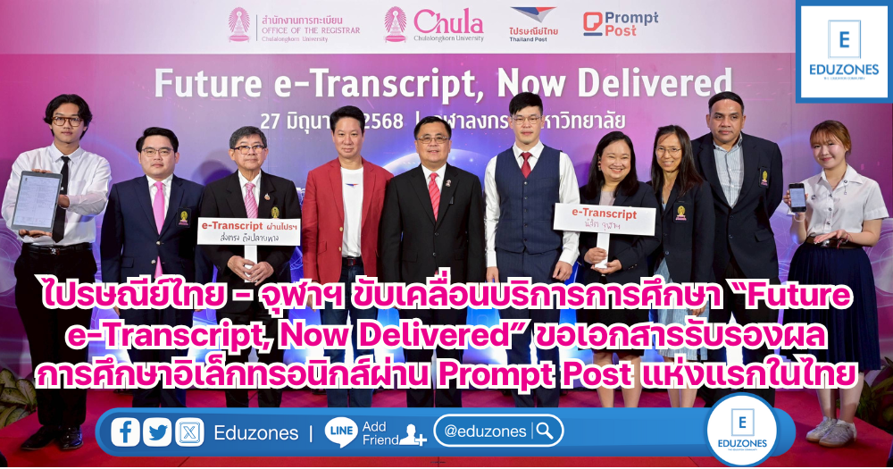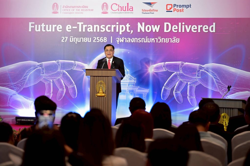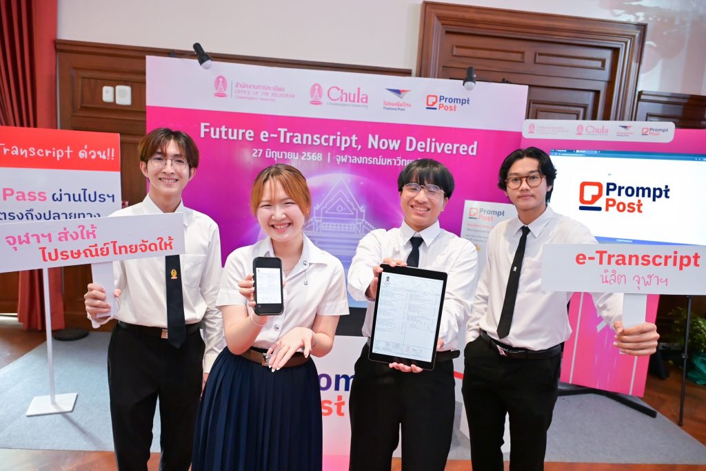 EZ Webmaster July 2, 2025 EZ Webmaster July 2, 2025 ไปรษณีย์ไทย – จุฬาฯ ขับเคลื่อนบริการการศึกษายุคดิจิทัล “Future e-Transcript, Now Delivered” ขอเอกสารรับรองผลการศึกษาอิเล็กทรอนิกส์ผ่าน Prompt Post แห่งแรกในไทย บริษัท ไปรษณีย์ไทย จำกัด ร่วมกับ จุฬาลงกรณ์มหาวิทยาลัย เปิดตัวระบบ “e-Transcript” หรือใบรับรองผลการศึกษาในรูปแบบดิจิทัลผ่านแอปพลิเคชัน Prompt Post เป็นครั้งแรกในประเทศไทย ช่วยยกระดับการจัดส่งเอกสารการศึกษาให้รวดเร็ว ปลอดภัย รองรับการใช้งานได้ทุกที่ ทุกเวลา ผ่าน Digital Postbox ส่วนบุคคล พร้อมเดินหน้าขยายผลสู่สถาบันการศึกษาทั่วประเทศ เพื่อร่วมกันวางมาตรฐานกลางของเอกสารดิจิทัลสำหรับภาคการศึกษา และต่อยอดสู่การใช้งานในองค์กรภาครัฐและเอกชนในอนาคต ทั้งนี้ บริการ e-Transcript ตั้งเป้าเริ่มให้บริการไตรมาส 3 ปีนี้ ศ.ดร.วิเลิศ ภูริวัชร อธิการบดีจุฬาลงกรณ์มหาวิทยาลัย เปิดเผยว่า ความร่วมมือระหว่างจุฬาลงกรณ์มหาวิทยาลัย และบริษัท ไปรษณีย์ไทย จำกัด ในครั้งนี้ จะเป็นก้าวสำคัญในการที่จุฬาฯ จะเป็นมหาวิทยาลัยแรกที่ใช้ระบบ e-transcript อย่างเต็มรูปแบบ รวมถึงสามารถตรวจสอบความถูกต้องและปลอดภัยได้อย่างครอบคลุม ถือเป็นการปฏิวัติวงการทะเบียนของมหาวิทยาลัยไทย และยังพร้อมที่จะส่งต่อองค์ความรู้นี้ไปยังมหาวิทยาลัยต่าง ๆ เพื่อการพัฒนาที่รอบด้านและยั่งยืน “จุฬาฯ ไม่เพียงแต่มุ่งพัฒนาในด้านการเรียนการสอนเท่านั้น ในการปฏิบัติงานด้านต่าง ๆ จุฬาฯ ก็ให้ความสำคัญเช่นกัน หนึ่งในนั้นคือระบบงานทะเบียนของสำนักงานการทะเบียนจุฬาฯ ที่เป็นผู้ริเริ่มที่จะพัฒนาแนวคิดการทำระบบ e – Transcript ซึ่งจะเป็นเครื่องมือที่ช่วยให้การทำงานในงานทะเบียนของมหาวิทยาลัยมีความคล่องตัว ทันสมัย ช่วยลดขั้นตอนและระยะเวลาในการขอ transcript รวมถึงยังสามารถป้องกันการปลอมแปลงเอกสาร ลดความเสี่ยงที่ข้อมูลจะหลุดรั่ว อีกทั้งยังสามารถสร้างความมั่นใจแก่องค์กรภายนอกที่ต้องการเอกสารสำคัญที่ได้รับการยืนยันจากจุฬาลงกรณ์มหาวิทยาลัยว่าเอกสารนั้นถูกต้องตรงตามความเป็นจริง” ศ. ดร.วิเลิศ กล่าว ผศ.ดร.เอกก์ ภทรธนกุล กรรมการและประธานกรรมการบริหาร บริษัท ไปรษณีย์ไทย จำกัด และ Chief Brand Officer จุฬาลงกรณ์มหาวิทยาลัย เปิดเผยว่า ตลอด 142 ปีที่ผ่านมา ไปรษณีย์ไทยคือแบรนด์ที่คนไทยมีความเชื่อมั่น ในวันที่ทุกธุรกิจให้บริการด้านการสื่อสารเข้าสู่การแข่งขันที่รุนแรง ทำให้ไปรษณีย์ไทยพัฒนาความแตกต่างที่เหนือไปจากความรวดเร็ว ด้วยการมียุทธศาสตร์และวิสัยทัศน์ดิจิทัลเพื่อต่อยอดความสำเร็จของแบรนด์ และเพิ่มศักยภาพในด้านการให้บริการที่มากขึ้น โดยในปี 2568 นี้ไปรษณีย์