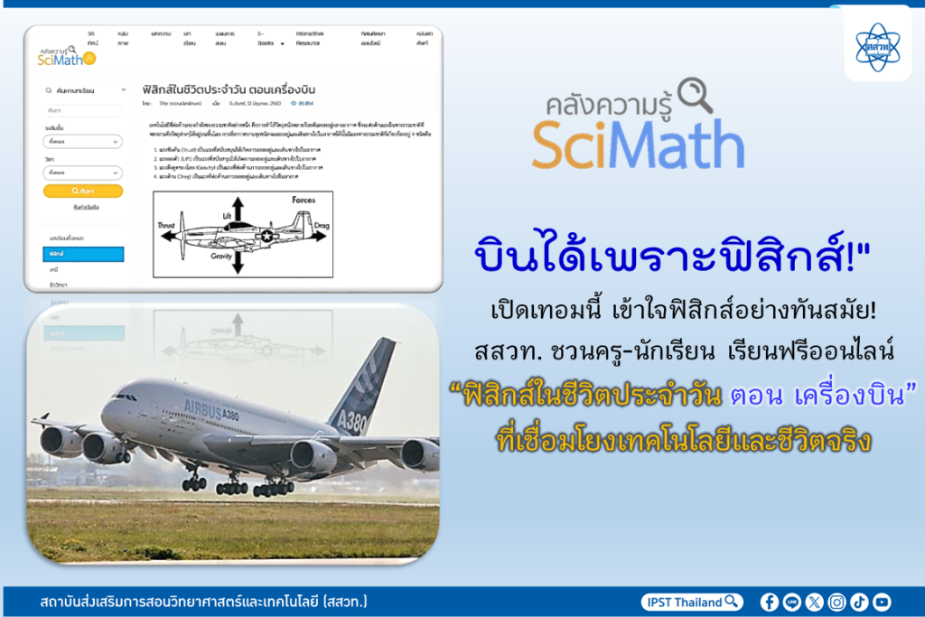 EZ Webmaster July 2, 2025 EZ Webmaster July 2, 2025 บินได้เพราะฟิสิกส์!” เปิดเทอมนี้ เข้าใจฟิสิกส์อย่างทันสมัย! สสวท. ชวนครู-นักเรียน เรียนฟรีออนไลน์ “ฟิสิกส์ในชีวิตประจำวัน ตอน เครื่องบิน” ที่เชื่อมโยงเทคโนโลยีและชีวิตจริง ในช่วงเปิดภาคเรียนนี้ สถาบันส่งเสริมการสอนวิทยาศาสตร์และเทคโนโลยี (สสวท.) ขอเชิญชวนครู นักเรียน และผู้ที่สนใจ มาเรียนรู้วิทยาศาสตร์ออนไลน์ฟรี ได้ที่คลังความรู้ SciMath สสวท. ในหัวข้อ “ฟิสิกส์ในชีวิตประจำวัน ตอน เครื่องบิน” ที่จะช่วยเปิดโลกวิทยาศาสตร์ให้เข้าใจง่าย ผ่านเรื่องราวที่ใกล้ตัว อย่างเรื่อง “การบิน” ซึ่งสะท้อนให้เห็นถึงการนำหลักฟิสิกส์มาใช้จริงในการพัฒนาเทคโนโลยีสมัยใหม่ โดยมีแรงธรรมชาติหลักที่เกี่ยวข้อง ได้แก่ แรงขับดัน (Thrust) แรงยกตัว (Lift) แรงดึงดูดของโลก (Gravity) และแรงต้าน (Drag) แรงแรงเหล่านี้ เป็นหัวใจสำคัญของการบิน และเทคโนโลยียานพาหนะอัตโนมัติที่มีบทบาทกับชีวิตประจำวันของเราในยุคดิจิทัล โดยสามารถทำให้วัตถุขนาดใหญ่ เช่น เครื่องบินลอยและเคลื่อนที่ในอากาศได้ สนใจเรียนรู้ได้ที่คลังความรู้ SciMath สสวท. คลิกที่ https://www.scimath.org/lesson-physics/item/7252-2017-06-12-15-49-46