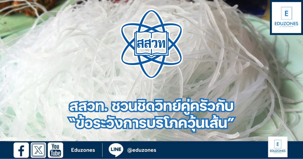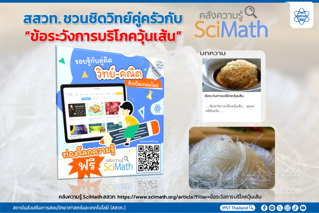 EZ Webmaster July 3, 2025 EZ Webmaster July 3, 2025 สสวท. ชวนชิดวิทย์คู่ครัวกับ “ข้อระวังการบริโภควุ้นเส้น” สถาบันส่งเสริมการสอนวิทยาศาสตร์และเทคโนโลยี (สสวท.) พารอบรู้ชีววิทยากับอาหารเส้นกลม ๆ ใส ๆ หารับประทานได้ไม่ยากกับบทความ “ข้อระวังการบริโภควุ้นเส้น” ทำความรู้จักกับ วุ้นเส้น อาหารจำพวกแป้งหรือคาร์โบไฮเดรตที่ทำจากแป้งถั่วเขียว ซึ่งเป็นอาหารแห้งชนิดหนึ่งที่มีลักษณะเป็นเส้นยาว ๆ ใส ๆ ไม่มีสี โดยมีทั้งวุ้นเส้นและวุ้นเส้นกึ่งสำเร็จรูป หาได้ทั่วไปในท้องตลาด รู้จักวุ้นเส้น ในมุมของวิทยาศาสตร์แล้วพบกับข้อแนะนำก่อนการบริโภคโดยควรนำวุ้นเส้นไปแช่น้ำ 15 นาทีและต้องให้เดือดเป็นเวลา 3 นาทีซึ่งเป็นเวลาที่ใช้กันทั่วไป ก็จะลดปริมาณซัลเฟอร์ไดออกไซด์ได้ค่อนข้างมาก เพิ่มเติมความรู้วิทยาศาสตร์เกี่ยวกับวุ้นเส้นได้ที่ คลังความรู้ SciMath สสวท. https://www.scimath.org/article?filter=ข้อระวังการบริโภควุ้นเส้น