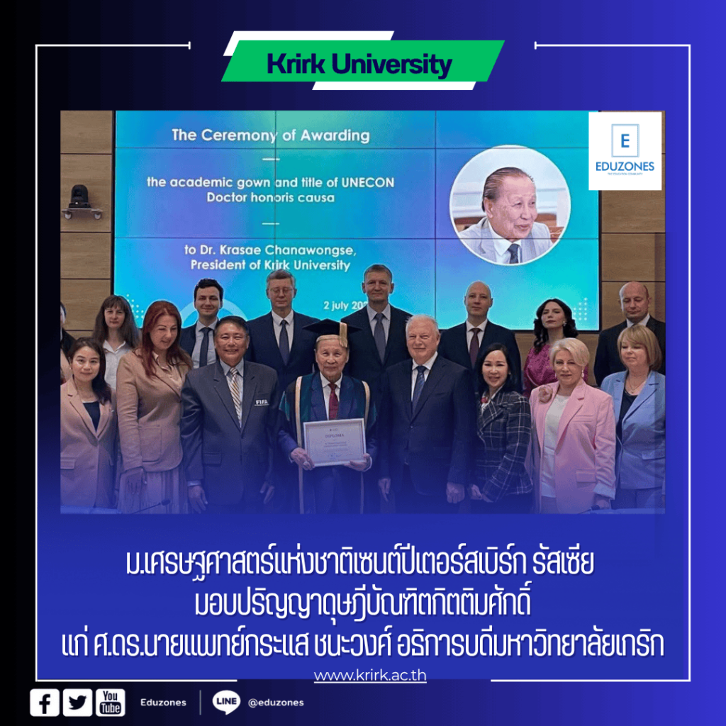 tui sakrapee July 8, 2025 tui sakrapee July 8, 2025 ม.เศรษฐศาสตร์แห่งชาติเซนต์ปีเตอร์สเบิร์ก ประเทศรัสเซีย มอบปริญญาดุษฎีบัณฑิตกิตติมศักดิ์แก่ ศ.ดร.นายแพทย์กระแส ชนะวงศ์ อธิการบดีมหาวิทยาลัยเกริก ศ.ดร.นายแพทย์กระแส ชนะวงศ์ อธิการบดีมหาวิทยาลัยเกริก ได้รับปริญญาดุษฎีบัณฑิตกิตติมศักดิ์จากมหาวิทยาลัยเศรษฐศาสตร์แห่งชาติเซนต์ปีเตอร์สเบิร์ก ประเทศรัสเซีย โดยศ.ดร.นายแพทย์กระแส ชนะวงศ์ ได้เดินทางไปยังนครเซนต์ปีเตอร์สเบิร์กด้วยตนเอง เพื่อเข้าร่วมพิธีรับปริญญาดังกล่าวอย่างเป็นทางการ ในพิธีมอบปริญญาดุษฎีบัณฑิตกิตติมศักดิ์ศ.ดร.นายแพทย์กระแส ชนะวงศ์ ได้กล่าวสุนทรพจน์ว่า “การได้รับปริญญาดุษฎีบัณฑิตกิตติมศักดิ์ในครั้งนี้ ไม่เพียงเป็นหมุดหมายใหม่ของชีวิตส่วนตัวเท่านั้น แต่ยังเป็นสัญลักษณ์แห่งการยอมรับในฐานะผู้ทำงานด้านการศึกษา ที่ได้อุทิศตนเพื่อความก้าวหน้าของสังคมมนุษย์ ในฐานะผู้มีความหลงใหลในศาสตร์การเรียนรู้และห่วงใยในสังคมมนุษย์อยู่เสมอ ผมมักจะเตือนตนเองว่า เมื่อความรู้เติบโตควบคู่ไปกับความเห็นอกเห็นใจและพลังแห่งการลงมือทำ สิ่งนั้นจะกลายเป็นแรงขับเคลื่อนสำคัญที่เปลี่ยนแปลงสังคม ดั่งเช่นในอดีตที่ผมได้รับรางวัลแมกไซไซก็เพราะความเชื่อมั่นในการอุทิศตนเพื่อมนุษยชาติและในวันนี้การได้รับปริญญาดุษฎีบัณฑิตกิตติมศักดิ์นี้ ก็ยิ่งตอกย้ำความมุ่งมั่นของผม ที่จะเดินหน้าสร้างประโยชน์ให้แก่สังคมมนุษย์อย่างไม่หยุดยั้ง” ศ.ดร.นายแพทย์กระแส ชนะวงศ์ อธิการบดีแห่งมหาวิทยาลัยเกริกซึ่งมีอายุ 92 ปีในปีนี้ได้กล่าวสุนทรพจน์ต่อคณาจารย์และนักศึกษาของมหาวิทยาลัยเศรษฐศาสตร์แห่งชาติเซนต์ปีเตอร์สเบิร์ก ในพิธีรับปริญญาดุษฎีบัณฑิตกิตติมศักดิ์ว่า“ข้าพเจ้ารู้สึกเป็นเกียรติอย่างยิ่งที่ได้รับเกียรติอันทรงคุณค่านี้ต่อหน้าทุกท่าน มหาวิทยาลัยเศรษฐศาสตร์แห่งชาติเซนต์ปีเตอร์สเบิร์กเป็นสถาบันการศึกษาชั้นนำที่มีชื่อเสียงระดับโลกมีความเป็นเลิศทางวิชาการ และมีประวัติศาสตร์อันยาวนานและลึกซึ้ง ข้าพเจ้ารู้สึกซาบซึ้งและเป็นเกียรติอย่างยิ่งที่ได้รับการยกย่องในครั้งนี้” อธิการบดีมหาวิทยาลัยเศรษฐศาสตร์แห่งชาติเซนต์ปีเตอร์สเบิร์ก ประเทศรัสเซีย ศาสตราจารย์ Igor Maksimtsevกล่าวถึงศ.ดร.นายแพทย์กระแส ชนะวงศ์ ว่า ศ.ดร.นายแพทย์กระแส ชนะวงศ์ อุทิศตนเพื่อการแก้ไขปัญหาทางเศรษฐกิจและสังคม ไม่เพียงในระดับประเทศเท่านั้น แต่ยังมีบทบาทสำคัญในการพัฒนาสังคมและเศรษฐกิจระดับนานาชาติ เขามีปฏิสัมพันธ์และความร่วมมืออย่างใกล้ชิดกับประชาคมระห