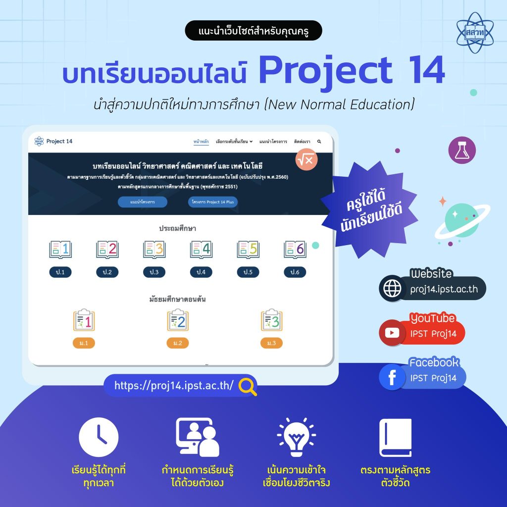 EZ Webmaster July 11, 2025 EZ Webmaster July 11, 2025 สสวท. พาโลดแล่นสู่ระบบสุริยะกับสื่อเรียนรู้ “การเกิดข้างขึ้น ข้างแรม” สถาบันส่งเสริมการสอนวิทยาศาสตร์และเทคโนโลยี (สสวท.) พาชั้นเรียนสนุกกับระบบสุริยะของเราด้วยการสร้างแบบจำลองที่อธิบายการเกิดข้างขึ้น ข้างแรม การเปลี่ยนแปลงเวลาขึ้นและตกของดวงจันทร์ กับวีดิทัศน์สื่อการสอน “ข้างขึ้น ข้างแรม” ไขข้อสงสัยว่าดวงจันทร์ซึ่งเป็นบริวารของโลกและโคจรรอบโลกทำให้เกิดปรากฏการณ์อะไรบ้าง หรือในบางวันและบางเวลาเราสามารถเห็นดวงจันทร์ในเวลากลางวันได้เพราะเหตุใด คลิกใช้งานฟรีที่ Project 14 สสวท. https://proj14.ipst.ac.th/m3/m3-sci-book1/sci-m3b1-024