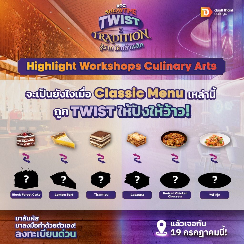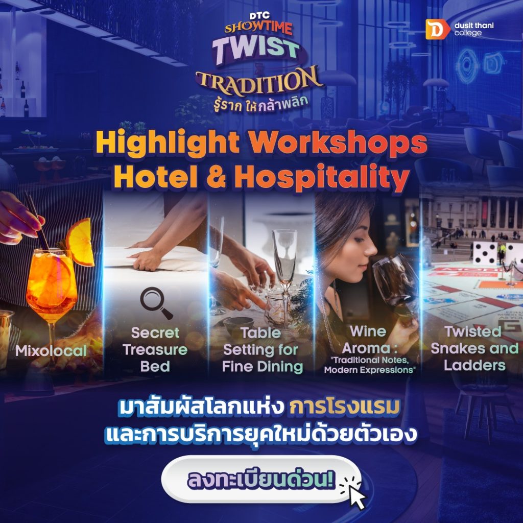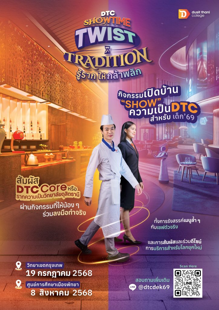 EZ Webmaster July 14, 2025 EZ Webmaster July 14, 2025 วิทยาลัยดุสิตธานีชวนน้องๆ ร่วมงาน “DTC Showtime: Twist Tradition รู้ราก ให้กล้าพลิก!” วิทยาลัยดุสิตธานี สถาบันการศึกษาชั้นแนวหน้าด้านธุรกิจบริการในเครือโรงแรมดุสิตธานี ขอชวนร่วมงานที่ “เด็ก ม.6” ไม่ควรพลาดเด็ดขาด กับงาน “DTC Showtime: Twist Tradition รู้ราก ให้กล้าพลิก!” จะเป็นอย่างไร เมื่อความคลาสสิกตามสไตล์วิทยาลัยดุสิตธานี ถูก Twist ให้ทันสมัย มาหาคำตอบด้วยตัวเอง สัมผัสการเรียนการสอน “สายครัว” และ “การโรงแรม” ในแบบ DTC 👨🍳 ลงมือทำเมนูจริงๆ ทั้งแบบ traditional และ twist ให้เข้ากับยุคสมัย กับเชฟมืออาชีพ 🏨 สัมผัสวิถีงานบริการของโรงแรมในยุคใหม่ พร้อมใช้เทคโนโลยีเป็นเครื่องมือช่วยสร้างประสบการณ์ในการเรียนรู้ 🌟 พร้อม Workshop และกิจกรรมสนุกจัดเต็ม! . 📍 สถานที่: วิทยาลัยดุสิตธานี กรุงเทพฯ 🗓 วันที่: 19 กรกฎาคม 2568 💸 ค่าลงทะเบียน: ปกติ 500 บาท พิเศษ! นักเรียนจากโรงเรียนที่มี MOU ชำระเพียง 300 บาท . 👉 ลงทะเบียนได้ที่: https://programs.dtc.ac.th/dek69-dtc-showtime-bangkok/ 📌 รับจำนวนจำกัด รีบจองก่อนเต็มนะ!