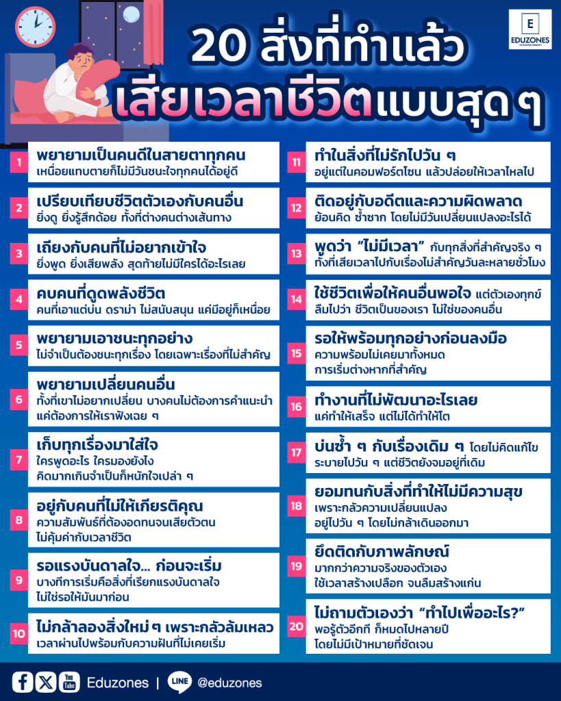 EZ Webmaster July 22, 2025 EZ Webmaster July 22, 2025 20 สิ่งที่ทำแล้วเสียเวลาชีวิตแบบสุด ๆ 1. พยายามเป็นคนดีในสายตาทุกคนเหนื่อยแทบตายก็ไม่มีวันชนะใจทุกคนได้อยู่ดี2. เปรียบเทียบชีวิตตัวเองกับคนอื่นยิ่งดู ยิ่งรู้สึกด้อย ทั้งที่ต่างคนต่างเส้นทาง3. เถียงกับคนที่ไม่อยากเข้าใจยิ่งพูด ยิ่งเสียพลัง สุดท้ายไม่มีใครได้อะไรเลย4. คบคนที่ดูดพลังชีวิตคนที่เอาแต่บ่น ดราม่า ไม่สนับสนุน แค่มีอยู่ก็เหนื่อย5. พยายามเอาชนะทุกอย่างไม่จำเป็นต้องชนะทุกเรื่อง โดยเฉพาะเรื่องที่ไม่สำคัญ6. พยายามเปลี่ยนคนอื่นทั้งที่เขาไม่อยากเปลี่ยนบางคนไม่ต้องการคำแนะนำ แค่ต้องการให้เราฟังเฉย ๆ7. เก็บทุกเรื่องมาใส่ใจใครพูดอะไร ใครมองยังไง คิดมากเกินจำเป็นก็หนักใจเปล่า ๆ8. อยู่กับคนที่ไม่ให้เกียรติคุณความสัมพันธ์ที่ต้องอดทนจนเสียตัวตน ไม่คุ้มค่ากับเวลาชีวิต9. รอแรงบันดาลใจ… ก่อนจะเริ่มบางทีการเริ่มคือสิ่งที่เรียกแรงบันดาลใจ ไม่ใช่รอให้มันมาก่อน10. ไม่กล้าลองสิ่งใหม่ ๆ เพราะกลัวล้มเหลวเวลาผ่านไปพร้อมกับความฝันที่ไม่เคยเริ่ม11. ทำในสิ่งที่ไม่รักไปวัน ๆ เพราะกลัวเปลี่ยนอยู่แต่ในคอมฟอร์ตโซน แล้วปล่อยให้เวลาไหลไป12. ติดอยู่กับอดีตและความผิดพลาดย้อนคิด ซ้ำซาก โดยไม่มีวันเปลี่ยนแปลงอะไรได้13. พูดว่า “ไม่มีเวลา” กับทุกสิ่งที่สำคัญจริง ๆทั้งที่เสียเวลาไปกับเรื่องไม่สำคัญวันละหลายชั่วโมง14. ใช้ชีวิตเพื่อให้คนอื่นพอใจ แต่ตัวเองทุกข์ลืมไปว่า ชีวิตเป็นของเรา ไม่ใช่ของคนอื่น15. รอให้พร้อมทุกอย่างก่อนลงมือความพร้อมไม่เคยมาทั้งหมด การเริ่มต่างหากที่สำคัญ16. ทำงานที่ไม่พัฒนาอะไรเลยแค่ทำให้เสร็จ แต่ไม่ได้ทำให้โต17. บ่นซ้ำ ๆ กับเรื่องเดิม ๆ โดยไม่คิดแก้ไขระบายไปวัน ๆ แต่ชีวิตยังจมอยู่ที่เดิม18. ยอมทนกับสิ่งที่ทำให้ไม่มีความสุข เพราะกลัวเปลี่ยนแปลงอยู่ไปวัน ๆ โดยไม่กล้าเดินออกมา19. ยึดติดกับภาพลักษณ์มากกว่าความจริงของตัวเองใช้เวลาสร้างเปลือก จนลืมสร้างแก่น20. ไม่ถามตัวเองว่า “ทำไปเพื่ออะไร?”พอรู้ตัวอีกที ก็หมดไปหลายปี โดยไม่มีเป้าหมายที่ชัดเจน ที่มา Read-Watch-Review