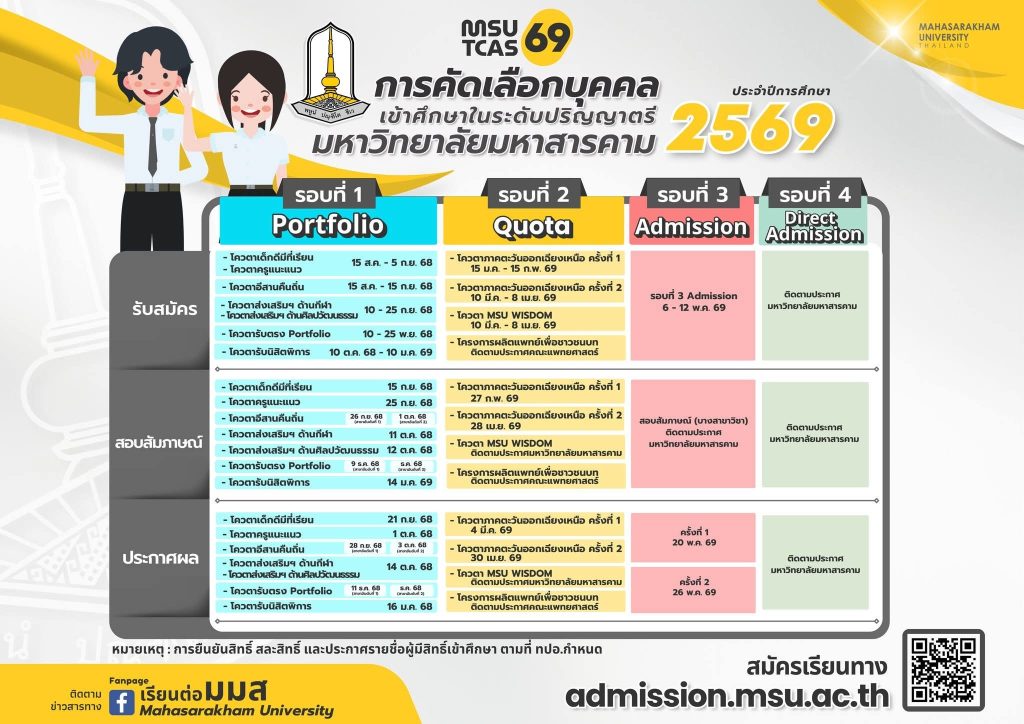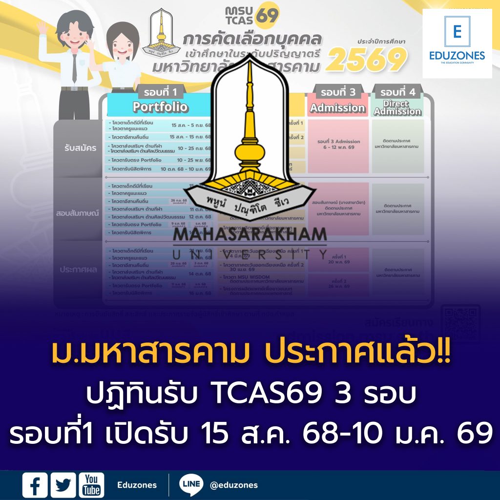 EZ Webmaster July 23, 2025 EZ Webmaster July 23, 2025 ม.มหาสารคาม ประกาศแล้ว!! ปฏิทินรับ TCAS69 3 รอบ ม.มหาสารคาม ประกาศแล้ว!! ปฏิทินรับ TCAS69 3 รอบ TCAS รอบที่ 1 : PORTFOLIO – รับสมัคร : 15 ส.ค. 68-10 ม.ค. 69 – สอบสัมภาษณ์ : เริ่ม 15 ก.ย. 68 – ช่องทางสมัคร : https://admission.msu.ac.th . TCAS รอบที่ 2 : QUOTA – รับสมัคร : 15 ม.ค.-8 เม.ย. 69 – สอบสัมภาษณ์ : เริ่ม 27 ก.พ. 69 – ช่องทางสมัคร : https://admission.msu.ac.th . TCAS รอบที่ 3 : ADMISSION – รับสมัคร : 6-12 พ.ค. 69 – สอบสัมภาษณ์ : รอประกาศ – ช่องทางสมัคร : https://www.mytcas.com . หมายเหตุ : กำหนดการรับสมัคร, สอบสัมภาษณ์ TCAS รอบ PORTFOLIOL และ TCAS รอบ QUOTA ขึ้นอยู่กับแต่ละโครงการ