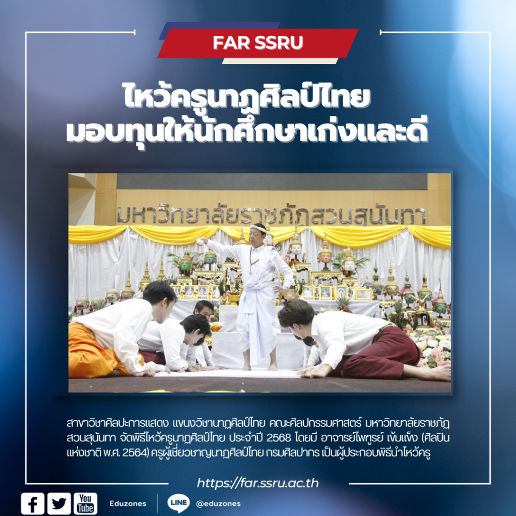 tui sakrapee July 25, 2025 tui sakrapee July 25, 2025 ศิลปกรรม สวนสุนันทา จัดไหว้ครูนาฏศิลป์ไทย พร้อมมอบทุนให้นักศึกษาเก่งและดี เมื่อวันที่ 24 กรกฎาคม 2568 สาขาวิชาศิลปะการแสดง แขนงวิชานาฏศิลป์ไทย คณะศิลปกรรมศาสตร์ มหาวิทยาลัยราชภัฏสวนสุนันทา จัดพิธีไหว้ครูนาฏศิลป์ไทย ประจำปี 2568 โดยมี อาจารย์ไพฑูรย์ เข้มแข็ง (ศิลปินแห่งชาติ พ.ศ. 2564) ครูผู้เชี่ยวชาญนาฏศิลป์ไทย กรมศิลปากร เป็นผู้ประกอบพิธีนำไหว้ครู และครอบครูให้แก่อาจารย์อาวุโส อาจารย์ปัจจุบัน นักศึกษาและศิษย์เก่า โดยก่อนเริ่มพิธีได้มีการมอบทุนการศึกษาให้กับนักศึกษาแขนงวิชานาฏศิลป์ไทย ที่มีผลการเรียนดี ประพฤติดีและบำเพ็ญประโยชน์แก่สังคม และนักศึกษาที่มีทักษะนาฏศิลป์ไทยดีเด่น (ตัวพระ-ตัวนาง) ในการนี้ ผู้ช่วยศาสตราจารย์ ดร.เอกพงศ์ อินเกื้อ คณบดีคณะศิลปกรรมศาสตร์ ได้ให้เกียรติเป็นประธานจุดธูปเทียนบูชาพระรัตนตรัย และธูปเทียนบูชาครู ณ โรงยิม ชั้น 4 ศูนย์สุขภาพและกีฬา กองพัฒนานักศึกษา มหาวิทยาลัยราชภัฏสวนสุนันทา ▾▾▾▾▾▾▾▾▾▾▾▾ งานประชาสัมพันธ์ คณะศิลปกรรมศาสตร์ website : https://far.ssru.ac.th x : https://twitter.com/pr_far instagram : far_ssru_fanpage tiktok : @farssru Tel. 0-2160-1388 ext.100 www.ssru.ac.th