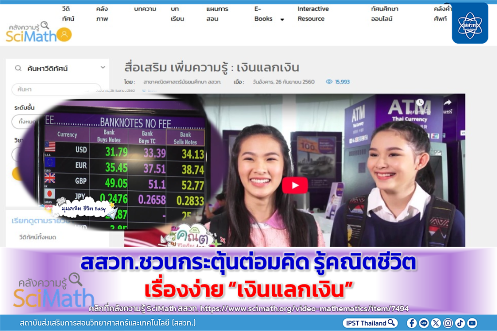 EZ Webmaster July 25, 2025 EZ Webmaster July 25, 2025 สสวท. ชวนกระตุ้นต่อมคิด รู้คณิตชีวิตเรื่องง่าย “เงินแลกเงิน” สถาบันส่งเสริมการสอนวิทยาศาสตร์และเทคโนโลยี (สสวท.) ชวนรักคณิตคู่คิดคู่การเดินทางกับสื่อเรียนรู้วีดิทัศน์รายการรู้คณิตชีวิตเรื่องง่าย ตอน เงินแลกเงิน สื่อเสริมเพิ่มความรู้ความเข้าใจประกอบหนังสือเรียนวิชาคณิตศาสตร์ สสวท. มัธยมศึกษาปีที่ 1 เรื่องอัตราส่วน สัดส่วน และร้อยละ ที่พาเรียนรู้ความสำคัญของคณิตศาสตร์กับการแลกเปลี่ยนเงินตราต่างประเทศ เหมาะทั้งนักเรียนและผู้สนใจทั่วไป ดูสบาย ไม่เคร่งเครียด คลิกที่คลังความรู้ SciMath สสวท. https://www.scimath.org/video-mathematics/item/7494