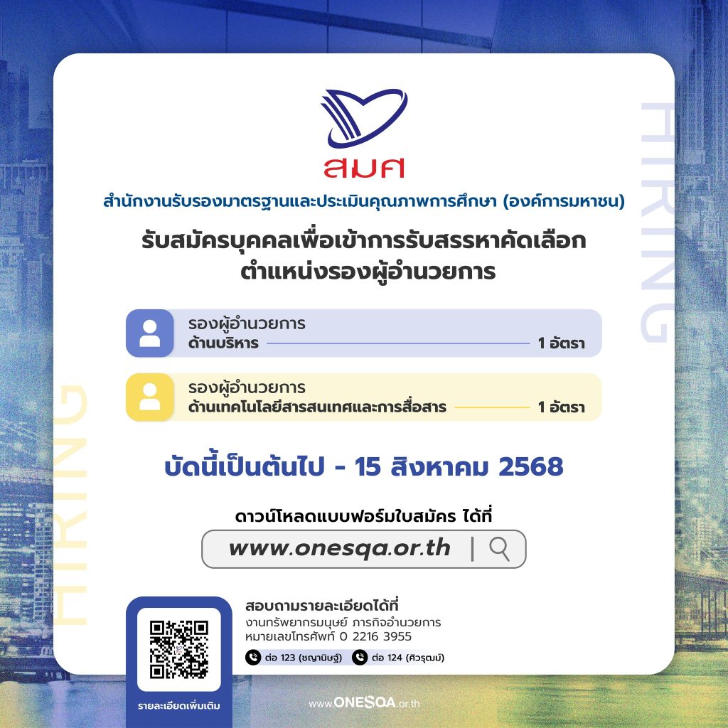 EZ Webmaster August 7, 2025 EZ Webmaster August 7, 2025 สมศ. เปิดรับสมัคร “รองผู้อำนวยการ” 2 ตำแหน่ง บริหาร–เทคโนโลยีสารสนเทศ สมัครได้ถึง 15 ส.ค. 2568 สำนักงานรับรองมาตรฐานและประเมินคุณภาพการศึกษา (องค์การมหาชน) (สมศ.) เปิดรับสมัครบุคคลเพื่อเข้ารับการสรรหาและคัดเลือก ตำแหน่งรองผู้อำนวยการ รองผู้อำนวยการ ด้านบริหาร จำนวน 1 อัตรา รองผู้อำนวยการ ด้านเทคโนโลยีสารสนเทศและการสื่อสาร จำนวน 1 อัตรา เปิดรับสมัครตั้งแต่บัดนี้ – 15 สิงหาคม 2568 ผู้สนใจสามารถดูรายละเอียดเพิ่มเติมและดาวน์โหลดใบสมัครได้ที่ เว็บไซต์ สมศ. www.onesqa.or.th สอบถามรายละเอียดเพิ่มเติมได้ที่งานทรัพยากรมนุษย์ ภารกิจอำนวยการ โทร. 0 2216 3955 ต่อ 123 (คุณชญานิษฐ์) และต่อ 124 (คุณศิวรุฒม์)