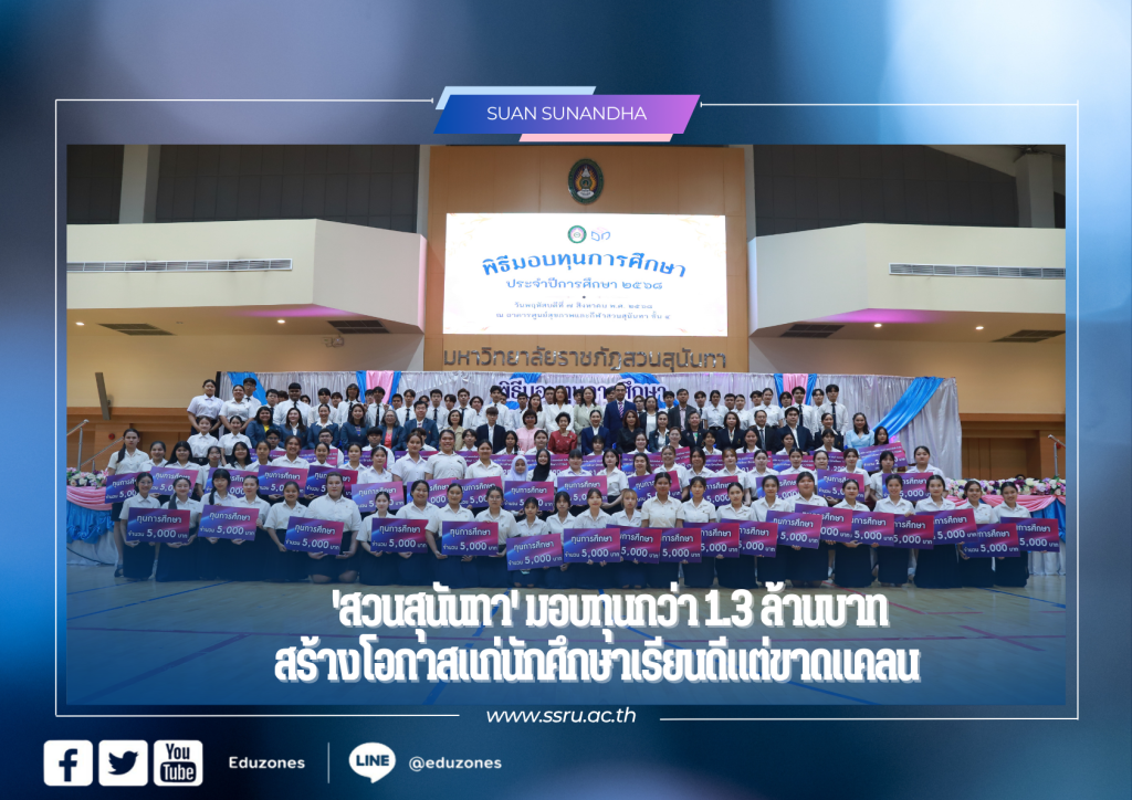 tui sakrapee August 7, 2025 tui sakrapee August 7, 2025 ‘สวนสุนันทา’ มอบทุนกว่า 1,390,000 บาท สร้างโอกาสทางการศึกษาแก่นักศึกษาเรียนดีแต่ขาดแคลน วันที่ 7 สิงหาคม 2568 มหาวิทยาลัยราชภัฏสวนสุนันทา จัดพิธีมอบทุนการศึกษา ประจำปีการศึกษา 2568 ณ ชั้น 4 อาคารศูนย์สุขภาพและกีฬา โดยมีนักศึกษาที่มีผลการเรียนดี ความประพฤติดี และมีความจำเป็นทางเศรษฐกิจได้รับการพิจารณาคัดเลือกให้รับทุนในครั้งนี้ รวมมูลค่าทุนการศึกษาทั้งสิ้นกว่า 1,393,000 บาท การมอบทุนในครั้งนี้ได้รับความร่วมมือและสนับสนุนจากหลากหลายภาคส่วน ทั้งบุคคลภายนอก องค์กรภาครัฐ ภาคเอกชน และหน่วยงานภายในมหาวิทยาลัย อาทิ – เหรัญญิก มูลนิธิครูไทยอาสา – Director Business Development บริษัท สมาร์ท เซอร์วิส แอนด์ แมเนจเม้นท์ จำกัด – บริษัท เจบีเอ็น เน็ตเวิร์ค โซลูชั่น จำกัด – ประธานคณะกรรมการส่งเสริมกิจการมหาวิทยาลัย และคณะกรรมการส่งเสริมกิจการมหาวิทยาลัย – สหกรณ์เครดิตยูเนี่ยน มหาวิทยาลัยราชภัฏสวนสุนันทา จำกัด – ชมรมผู้เกษียณ มหาวิทยาลัยราชภัฏสวนสุนันทา – สภาคณาจารย์และข้าราชการ มหาวิทยาลัยราชภัฏสวนสุนันทา – รองอธิการบดีฝ่ายเทคโนโลยีดิจิทัล มหาวิทยาลัยราชภัฏสวนสุนันทา – รองผู้บังคับการ กองบังคับการปราบปรามการกระทำความผิดเกี่ยวกับอาชญากรรมทางเทคโนโลยี กองบัญชาการตำรวจสอบสวนกลาง (CIB) การสนับสนุนทุนการศึกษาครั้งนี้ถือเป็นการส่งเสริมโอกาสทางการศึกษาแก่เยาวชน อีกทั้งยังสะท้อนถึงความร่วมมือระหว่างมหาวิทยาลัยและภาคีเครือข่ายทุกภาคส่วนที่ร่วมกันขับเคลื่อนและพัฒนานักศึกษาให้เติบโตเป็นทรัพยากรมนุษย์ที่มีคุณภาพของประเทศ .