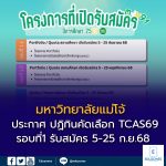 EZ Webmaster August 9, 2025 EZ Webmaster August 9, 2025 มหาวิทยาลัยเทคโนโลยีพระจอมเกล้าธนบุรี (มจธ.) ประกาศ ปฏิทินคัดเลือก TCAS69 มหาวิทยาลัยเทคโนโลยีพระจอมเกล้าธนบุรี (มจธ.) ประกาศ ปฏิทินคัดเลือก TCAS69 รอบที่ 1 Portfolio– Early Admission เริ่มรับสมัคร วันที่ 17 ต.ค.68– Portfolio เริ่มรับสมัคร วันที่ 24 ต.ค.68สมัครกับ มจธ. ที่ https://join.kmutt.ac.thรอบที่ 2 โควตา เริ่มรับสมัคร วันที่ 12 ก.พ.69 เป็นต้นไป สมัครกับ มจธ. ที่ https://join.kmutt.ac.thรอบที่ 3 แอดมิชชัน รับสมัคร วันที่ 6-12 พ.ค.69 สมัครกับ ทปอ. ที่ mytcas.comรอบที่ 4 รับตรงอิสระ รับสมัคร วันที่ 28 พ.ค.69 – 1 มิ.ย.69 สมัครกับ มจธ. ที่ https://join.kmutt.ac.th