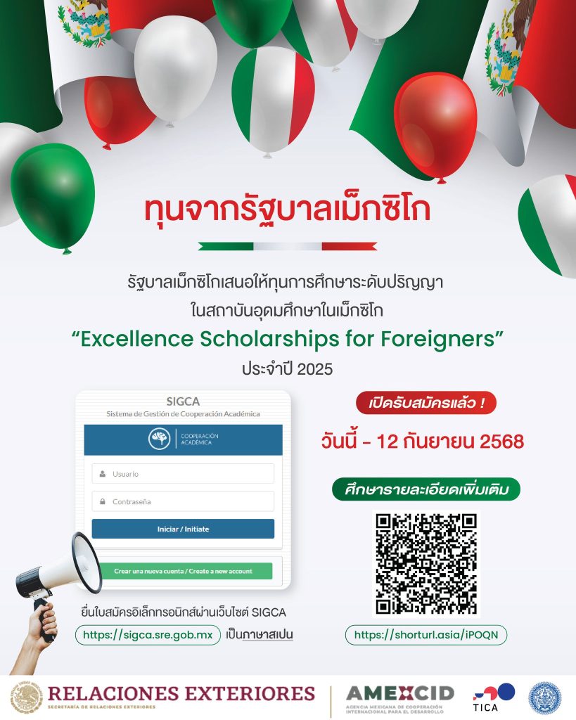 EZ Webmaster August 11, 2025 EZ Webmaster August 11, 2025 ทุนรัฐบาลเม็กซิโก สำหรับศึกษาระดับปริญญา หมดเขตสมัคร 12 กันยายน 2568 Mexico is calling TICA ชวนพี่ๆ น้องๆ ไปเปิดโลกแลกเปลี่ยนประสบการณ์การศึกษาที่ “เม็กซิโก“ กระทรวงการต่างประเทศเม็กซิโก โดย AMEXCID เสนอให้ทุนการศึกษา “Excellence Scholarships for Foreigners” ประจำปี ค.ศ 2025 สำหรับศึกษาระดับปริญญา ในสถาบันอุดมศึกษาของเม็กซิโก รายละเอียดการสมัคร เงื่อนไขการรับทุน ศึกษาได้ตาม QR code หรือ (https://tica-thaigov.mfa.go.th/th/page/ทุนประเภท-1-ข)เปิดรับสมัคร ตั้งแต่บัดนี้ – 12 กันยายน 2568 เวลา 15.00 น (ตามเวลาเม็กซิโก) ประกาศผล 8-13 ตุลาคม 2568โอกาสดี ๆ แบบนี้…อย่าปล่อยให้หลุดมือ!
