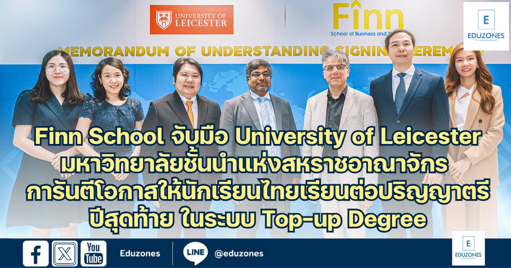 EZ Webmaster August 11, 2025 EZ Webmaster August 11, 2025 Finn School จับมือ University of Leicester มหาวิทยาลัยชั้นนำแห่งสหราชอาณาจักร การันตีโอกาสให้นักเรียนไทยเรียนต่อปริญญาตรีปีสุดท้าย ในระบบ Top-up Degree นายกวิน พันธ์ประสิทธิเวช กรรมการผู้จัดการสถาบัน Finn (ฟินน์) พร้อมด้วย ดร. ปริญญ์ ศุกรีเขตร ผู้อำนวยการฝ่ายวิชาการ ร่วมลงนามความร่วมมือกับ ศาสตราจารย์นิชาน คานาการาชาห์ อธิการบดีมหาวิทยาลัยเลสเตอร์ มหาวิทยาลัยเก่าแก่ชื่อดังและเป็นจุดหมายยอดนิยมของนักศึกษาไทยที่ต้องการศึกษาในมหาวิทยาลัยระดับโลก โดยที่ Finn คือทางลัดสู่การจบปริญญาตรีจากมหาวิทยาลัยชั้นนำในอังกฤษและสวิตเซอร์แลนด์ภายในเวลาเพียง 3 ปี โดยใช้ระบบการเรียนแบบ 2+1 นักเรียนจะเรียน 2 ปีแรกในไทยกับหลักสูตรระดับสากล UK Level 4 & Level 5 Diploma และเลือกเรียนปริญญาตรีปีสุดท้าย (Top-up Degree) อีก 1 ปีกับมหาวิทยาลัยพาร์ทเนอร์ที่การันตีการเข้าเรียนต่อกว่า 27 แห่งในอังกฤษและสวิตเซอร์แลนด์ซึ่งจบแล้วได้รับวุฒิปริญญาตรีจากมหาวิทยาลัยนั้นโดยตรง ในการจับมือครั้งนี้มีผู้แทนจากมหาวิทยาลัยและพันธมิตรเข้าร่วมมากมาย อาทิ อธิการบดี University of Leicester, Deputy Head of the College of Business, Director of Public Affairs และตัวแทนจากสถานทูตอังกฤษประจำประเทศไทยที่มีบทบาทร่วมผลักดันหลักสูตรร่วมกัน นอกจากนี้สถาบัน Finn ยังมีความร่วมมือกว่าอีก 26 มหาวิทยาลัย นำโดย Swansea University มหาวิทยาลัยที่ติดอันดับ Top 83 ของโลก และ Top 10 ของสหราชอาณาจักรในสาขาบริหารธุรกิจ, Bournemouth University, Coventry University, University of Portsmouth และมหาวิทยาลัยชั้นนำอื่น ๆ อีกมากมาย