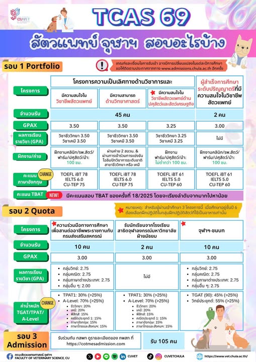 EZ Webmaster August 11, 2025 EZ Webmaster August 11, 2025 คณะสัตวแพทยศาสตร์ จุฬาฯ ประกาศ จำนวนรับ ในระบบTCAS69 คณะสัตวแพทยศาสตร์ จุฬาฯ ประกาศ จำนวนรับ ในระบบTCAS69 เปิดรับ 3 รอบ รับรวม 174 คน – รอบที่ 1 #Portfolio 2 โครงการ รวม 47 คน – รอบที่ 2 #โควตา 3 โครงการ รวม 22 คน – รอบที่ 3 #แอดมิชชัน รับผ่าน กสพท รวม 105 คน