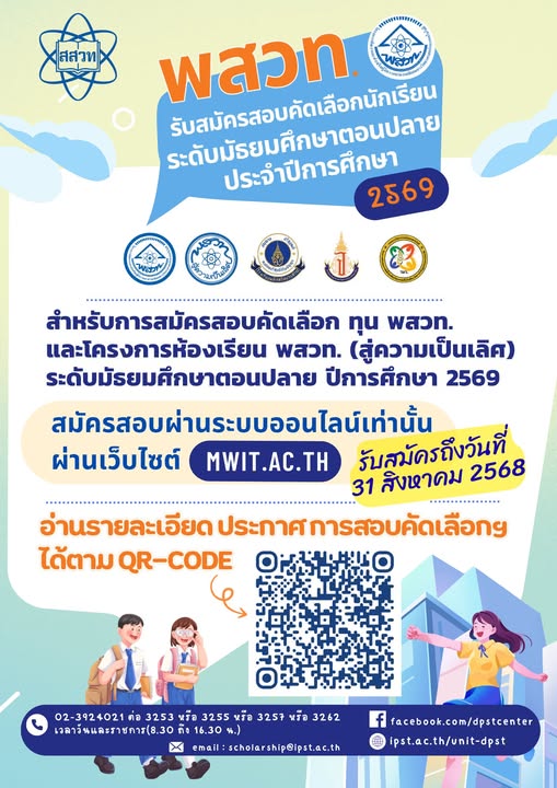 EZ Webmaster August 15, 2025 EZ Webmaster August 15, 2025 สสวท. รับสมัครนักเรียนทุน พสวท. สร้างนักวิทยาศาสตร์พัฒนาชาติไทย สถาบันส่งเสริมการสอนวิทยาศาสตร์และเทคโนโลยี (สสวท.) รับสมัครนักเรียนที่กำลังศึกษาอยู่ชั้นมัธยมศึกษาปีที่ 3 หรือเทียบเท่าในปีการศึกษา 2568 สมัครสอบคัดเลือกทุนโครงการพัฒนาและส่งเสริมผู้มีความสามารถพิเศษทางวิทยาศาสตร์และเทคโนโลยี (ทุน พสวท.) ระดับมัธยมศึกษาตอนปลาย จำนวน 40 ทุนและ โครงการห้องเรียน พสวท. (สู่ความเป็นเลิศ) จำนวนไม่เกิน 30 คนต่อศูนย์โรงเรียน พสวท. ดูรายละเอียดที่ เฟซบุ๊ก พสวท. DPST Center : https://www.facebook.com/dpstcenter สมัครได้ถึง 31 สิงหาคม 2568 ที่เว็บไซต์ www.mwit.ac.th สอบถามข้อมูลทุน พสวท. ที่ scholarship@ipst.ac.th หรือ ฝ่าย พสวท. 0 2392- 4021 ต่อ 3253 , 3255 ,3257 และ 3262 สอบถามระบบการสมัครที่ https://www.facebook.com/MWITadmission