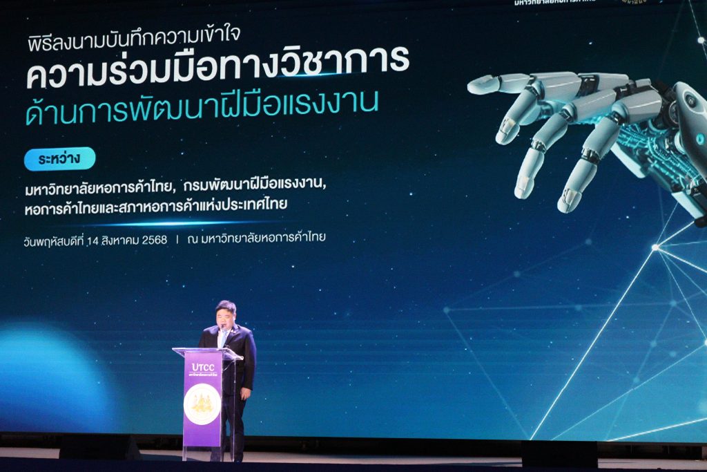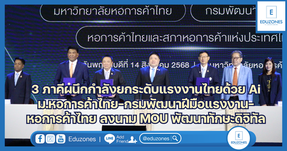 EZ Webmaster August 15, 2025 EZ Webmaster August 15, 2025 3 ภาคีผนึกกำลังยกระดับแรงงานไทยด้วย Ai ม.หอการค้าไทย-กรมพัฒนาฝีมือแรงงาน-หอการค้าไทย ลงนาม MOU พัฒนาทักษะดิจิทัล นายพงศ์กวิน จึงรุ่งเรืองกิจ รัฐมนตรีว่าการกระทรวงแรงงาน เป็นประธานในพิธีลงนามบันทึกความเข้าใจความร่วมมือทางวิชาการด้านการพัฒนาฝีมือแรงงาน ระหว่างมหาวิทยาลัยหอการค้าไทย กรมพัฒนาฝีมือแรงงาน และหอการค้าไทยและสภาหอการค้าแห่งประเทศไทย ณ หอประชุม มหาวิทยาลัยหอการค้าไทย พร้อมทดลองทดสอบมาตรฐานฝีมือแรงงานแห่งชาติ สาขาพนักงานการใช้คอมพิวเตอร์ (เจเนอเรทีฟเอไอ) ระดับ 2 ให้แก่นักศึกษาที่ลงทะเบียนด้วย รองศาสตราจารย์ ดร.ธนวรรธน์ พลวิชัย อธิการบดีมหาวิทยาลัยหอการค้าไทย เปิดเผยว่า “ขอขอบคุณท่านรัฐมนตรีว่าการกระทรวงแรงงาน นายพงศ์กวิน จึงรุ่งเรืองกิจ ที่ให้เกียรติเป็นประธานในพิธีสำคัญนี้ ขอบคุณท่านอธิบดีกรมพัฒนาฝีมือแรงงาน นายเดชา พฤกษ์พัฒนรักษ์ ที่ให้การสนับสนุนและผลักดันให้เกิดความร่วมมือครั้งนี้ขึ้น และ ดร.พจน์ อร่ามวัฒนานนท์ ประธานกรรมการหอการค้าไทยและสภาหอการค้าแห่งประเทศไทย ซึ่งถือเป็นก้าวสำคัญในการผนึกกำลัง 3 ภาคี เพื่อยกระดับทักษะแรงงานไทยให้ตอบโจทย์ความต้องการของตลาดแรงงานยุคดิจิทัล ในฐานะ Ai-First University แห่งแรกของประเทศไทย เรามีความพร้อมอย่างยิ่งในการเป็นต้นแบบการพัฒนาฝีมือแรงงานด้าน Ai โดยนักศึกษาทุกคนของเราต้องเรียนวิชา Ai101 ตั้งแต่ปีแรก ซึ่งสอนโดยอาจารย์ผู้เชี่ยวชาญจากหลากหลายคณะ อธิการบดี ม.หอการค้าไทย กล่าวต่อว่า “วันนี้เรามีตัวแทนนักศึกษาเข้าร่วมทดลองทดสอบมาตรฐานฝีมือแรงงาน ซึ่งแสดงให้เห็นถึงความกระตือรือร้น และความพร้อมของนักศึกษาที่จะพัฒนาตนเองให้มีทักษะที่ได้มาตรฐาน เราจะบูรณาการความรู้จากคณะวิศวกรรมศาสตร์ คณะวิทยาศาสตร์ และคณะอื่นๆ เข้ากับหลักสูตรฝึกอบรม พร้อมดำเนินการขออนุญาตจัดตั้งศูนย์ทดสอบมาตรฐานฝีมือแรงงานแห่งชาติภายในมหาวิทยาลัย เพื่อรองรับการทดสอบนักศึกษากว่า 6,000 คนต่อปี” “ภายใต้ความร่วมมือนี้ เราจะได้รับการสนับสนุนจากกรมพัฒนาฝีมือแรงงานในการพัฒนาหลักสูตร การจัดตั้งศูนย์ทดสอบ และการส่งเสริมให้นักศึกษาฝึกงานแบบสหกิจศึกษาได้รับสิทธิประโยชน์ตาม พ.ร.บ.ส่งเสริมการพัฒนาฝีมือแรงงาน พ.ศ. 2545 ขณะที่หอการค้าไทยจะช่วยประชาสัมพันธ์ให้สมาชิกทั่วประเทศ ซึ่งมีสถานประกอบการกว่า 50,000 ราย ให้ความสำคัญกับการจ้างงานบัณฑิตที่ผ่านการทดสอบมาตรฐานฝีมือแรงงาน เพื่อให้นักศึกษาของเรามีโอกาสเข้าสู่ตลาดแรงงานได้ทันที” รองศาสตราจารย์ ดร.ธนว