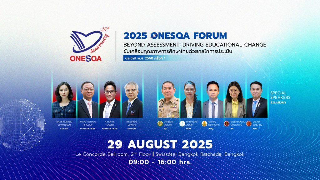 EZ Webmaster August 20, 2025 EZ Webmaster August 20, 2025 สมศ. ระดมภาคีด้านการศึกษา เปิดเวทีประชุมวิชาการระดับนานาชาติ เสริมแกร่งร่วมขับเคลื่อนคุณภาพการศึกษาไทยด้วยกลไกการประเมิน สำนักงานรับรองมาตรฐานและประเมินคุณภาพการศึกษา (องค์การมหาชน) (สมศ.) ขอเชิญชวนสถานศึกษาและบุคคลทั่วไปร่วมรับชม Live : 2025 ONESQA Forum การประชุมวิชาการระดับชาติและนานาชาติ ประจำปี พ.ศ. 2568 ครั้งที่ 1 ภายใต้หัวข้อ “Beyond Assessment: Driving Educational Change ขับเคลื่อนคุณภาพการศึกษาไทยด้วยกลไกการประเมิน” ในวันศุกร์ที่ 29 สิงหาคม 2568 ตั้งแต่เวลา 09.00 – 16.00 น. ผู้เข้าร่วมชมจะได้รับทราบถึงเป้าหมายของ สมศ. ในการเดินหน้าพลิกบทบาทจากการประเมินเพื่อตัดสินคุณภาพ ไปสู่การสนับสนุนการพัฒนาคุณภาพการศึกษา และข้อเสนอเชิงนโยบายที่ได้จากการวิเคราะห์ข้อมูลผลการประเมินเพื่อขับเคลื่อนมาตรฐานคุณภาพการศึกษาไทย พร้อมร่วมรับชมไฮไลท์พิเศษที่น่าสนใจ ได้แก่ ปาฐกถาพิเศษในหัวข้อ “บทบาทของการประเมินเพื่อยกระดับมาตรฐานคุณภาพการศึกษาไทย” โดย ผู้ช่วยศาสตราจารย์ ดร.ลิณธิภรณ์ วริณวัชรโรจน์ รัฐมนตรีช่วยว่าการกระทรวงศึกษาธิการ การบรรยายในหัวข้อ “ขับเคลื่อนคุณภาพให้ยั่งยืนด้วยหลักการประเมินการศึกษา 5.0” โดย ศาสตราจารย์พิเศษ ดร.ทศพร ศิริสัมพันธ์ กรรมการ สมศ. การนำเสนอ “จากข้อมูลสู่การขับเคลื่อนคุณภาพ: วิสัยทัศน์ ยุทธศาสตร์ และเครื่องมือใหม่ของ สมศ.” โดย ศาสตราจารย์ ดร.องอาจ นัยพัฒน์ ผู้อำนวยการ สมศ. การนำเสนอ “สารสนเทศจากข้อมูลผลการประเมิน เพื่อขับเคลื่อนคุณภาพการศึกษาไทยด้วยข้อเสนอเชิงนโยบาย” โดย ศาสตราจารย์ ดร.พิริยะ ผลพิรุฬห์ กรรมการ สมศ. การเสวนา “ทัศนะของผู้บริหารระดับสูงต่อการนำข้อเสนอเชิงนโยบายจาก สมศ. ไปใช้กำหนดยุทธศาสตร์การพัฒนาคุณภาพการศึกษาไทย” ผู้สนใจ สามารถรับชมพร้อมกันได้ที่ เฟสบุ๊ค เพจ สมศ. (สำนักงานรับรองมาตรฐานและประเมินคุณภาพการศึกษา) โดยไม่มีค่าใช้จ่าย ได้ตามวันและเวลาดังกล่าว หรือสอบถามข้อมูลเพิ่มเติมได้ที่ 02-216-3955