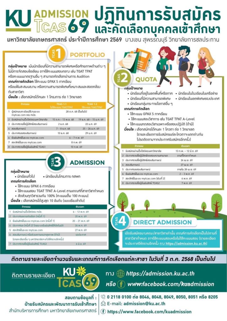 EZ Webmaster August 21, 2025 EZ Webmaster August 21, 2025 ม.เกษตรศาสตร์ ประกาศ ปฏิทินคัดเลือก TCAS69 ม.เกษตรศาสตร์ ประกาศ ปฏิทินคัดเลือก TCAS69 รอบที่ 1 Portfolio – ครั้งที่ 1 รับสมัคร วันที่ 15 ต.ค.68 – 13 พ.ย.68 – ครั้งที่ 2 รับสมัคร วันที่ 19 ธ.ค.68 – 15 ม.ค.69 สมัครกับ ม.เกษตรศาสตร์ ที่ https://admission.ku.ac.th รอบที่ 2 โควตา รับสมัคร วันที่ 13 ก.พ.69 – 12 มี.ค.69 สมัครกับ ม.เกษตร ที่ https://admission.ku.ac.th รอบที่ 3 แอดมิชชัน รับสมัคร วันที่ 6-12 พ.ค.69 สมัครกับ ทปอ. ที่ http://mytcas.com รอบที่ 4 direct admission รอประกาศ