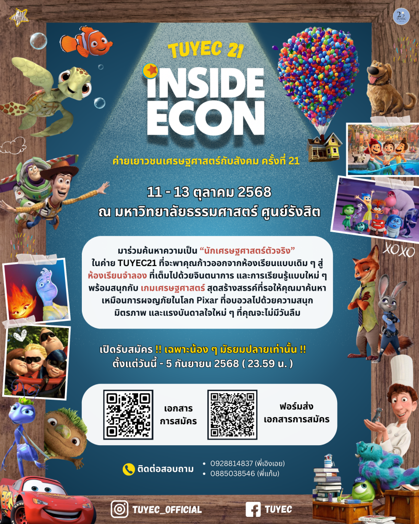 EZ Webmaster August 27, 2025 EZ Webmaster August 27, 2025 เปิดรับสมัครแล้ว ค่ายเยาวชนเศรษฐศาสตร์กับสังคม ครั้งที่ 21 (TUYEC 21) 💫 สิ้นสุดการรอคอย! เปิดรับสมัครแล้ววันนี้ ค่ายเยาวชนนักเศรษฐศาสตร์กับสังคม ครั้งที่ 21 ‘Thammasat University Young Economist Camp 21 (TUYEC21)’ ในปีนี้พวกเราจะพาทุกคนออกเดินทางผจญภัยไปด้วยกันในโลกของ 💡“ INSIDE ECON ” 📖🫧 ที่เต็มไปด้วยจินตนาการและเรื่องราวมากมายรอให้ทุกคนมาค้นหา และเรียนรู้ไปด้วยกัน ไม่ว่าจะเป็น.. ⟡ การค้นหาความเป็น ‘นักเศรษฐศาสตร์ตัวจริง‘ ในตัวคุณผ่านการเรียนรู้รูปแบบใหม่ ๆ อย่าง ‘ห้องเรียนจำลอง’ โดยอาจารย์ผู้เชี่ยวชาญ 🧑🏻🏫🔍 ⟡ สนุกไปกับ ‘เกมเศรษฐศาสตร์‘ สุดสร้างสรรค์ที่บอกเลยว่า ห้ามพลาดด❗️ 📺 กิจกรรมจัดขึ้นในวันที่ 11 – 13 ตุลาคม 2568 (3 วัน 2 คืน) ณ มหาวิทยาลัยธรรมศาสตร์ ศูนย์รังสิต 🖍️ เปิดรับสมัครตั้งแต่วันนี้ – 5 กันยายน 2568 เวลา 23.59 น. 📫 ประกาศรายชื่อผู้ผ่านการคัดเลือกในวันที่ 10 กันยายน 2568 ผ่านช่องทาง IG: tuyec_official และ FB page: TUYEC 🧽 ค่าสวัสดิการ 1,370 บาท (ชำระหลังประกาศรายชื่อผู้ผ่านการคัดเลือก) 📎 เอกสารประกอบการสมัคร: https://drive.google.com/drive/folders/1Y2moIMhALo9H8dJueVGekMwxBX95Xxw0 📎 ฟอร์มส่งเอกสารการสมัคร: https://forms.gle/cCcQk8MMYxbyHy999 สแกน QR code ในรูป ☎️ ติดต่อสอบถามเพิ่มเติมได้ที่ • 0928814837 (พี่เอิงเอย) • 0885038546 (พี่แก้ม) มาร่วมเดินทางและสร้างเรื่องราวใหม่ไปด้วยกันที่ค่าย TUYEC 21 🌟