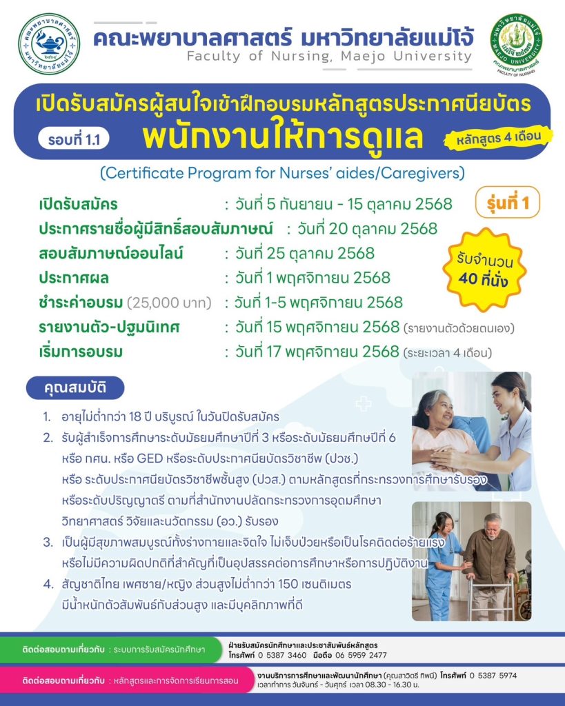 EZ Webmaster August 29, 2025 EZ Webmaster August 29, 2025 คณะพยาบาลศาสตร์ มหาวิทยาลัยแม่โจ้ เปิดรับสมัครผู้สนใจเข้าฝึกอบรม หลักสูตรประกาศนียบัตร “พนักงานให้การดูแล” 📣 ข่าวดีข่าวด่วน ! อบรมเพียง 4 เดือน มีงานรองรับ ✨ 🏥 คณะพยาบาลศาสตร์ มหาวิทยาลัยแม่โจ้ เปิดรับสมัครผู้สนใจเข้าฝึกอบรม หลักสูตรประกาศนียบัตร “พนักงานให้การดูแล” 📚 หลักสูตร 4 เดือน ”เป็นหลักสูตรที่สภาการพยาบาล“ ให้การรับรองแล้ว 👩🎓 คุณสมบัติผู้สมัคร ✔️ จบ ม.3 / ม.6 / ปวช. / กศน. / GED / ปวส. / ปริญญาตรีขึ้นไป ✔️ ทุกแผนการเรียน / ทุกสาขาวิชา ✔️ และต้องมีอายุไม่ต่ำกว่า 18 ปี 📝 กำหนดการรับสมัคร 📅 สมัคร : 5 กันยายน – 15 ตุลาคม 2568 💻 สอบสัมภาษณ์ออนไลน์ : 20 ตุลาคม 2568 📢 ประกาศผล : 1 พฤศจิกายน 2568 💰 ชำระเงินค่าฝึกอบรม (เหมาจ่าย 25,000 บาท) 📅 วันที่ 1 – 5 พฤศจิกายน 2568 🚀 เปิดวันฝึกอบรม : 17 พฤศจิกายน 2568 📆 ระยะเวลา 4 เดือน 📞 ติดต่อสอบถาม 🎓 เกี่ยวกับหลักสูตร / การเรียนการสอน / การฝึกอบรม ติดต่อ : งานบริการการศึกษาและพัฒนานักศึกษา คณะพยาบาลศาสตร์ ☎️ 0-5387-5974 (ในวันและเวลาราชการ) 🖥️ เกี่ยวกับระบบการรับสมัคร ☎️ 0-5387-3460 หรือ 06-5959-2477 (ในวันและเวลาราชการ)