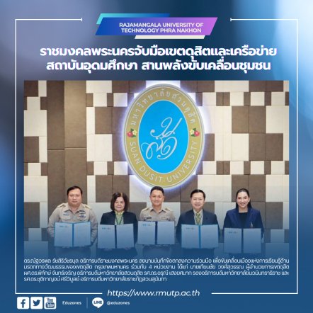 tui sakrapee August 27, 2025 ราชมงคลพระนครจับมือเขตดุสิตและเครือข่ายสถาบันอุดมศึกษา สานพลังขับเคลื่อนชุมชน tui sakrapee August 27, 2025 ราชมงคลพระนครจับมือเขตดุสิตและเครือข่ายสถาบันอุดมศึกษา สานพลังขับเคลื่อนชุมชน พร้อมยกระดับมรดกทางวัฒนธรรมให้เป็นศูนย์กลางการเรียนรู้ที่ยั่งยืน มหาวิทยาลัยเทคโนโลยีราชมงคลพระนคร ร่วมลงนามความร่วมมือ (MOU) กับหน่วยงานภาครัฐและสถาบันการศึกษา เพื่อพัฒนาการศึกษาอย่างมีคุณภาพและต่อเนื่อง ล่าสุด ดร.ณัฐวรพล รัชสิริวัชรบุล อธิการบดีราชมงคลพระนคร ลงนามบันทึกข้อตกลงความร่วมมือ เพื่อขับเคลื่อนเมืองแห่งการเรียนรู้ด้านมรดกทางวัฒนธรรมของเขตดุสิต กรุงเทพมหานคร ร่วมกับ 4 หน่วยงาน ได้แก่ นายเทียนชัย วงศ์สุวรรณ ผู้อำนวยการเขตดุสิต ผศ.ดร.พิทักษ์ จันทร์เจริญ อธิการบดีมหาวิทยาลัยสวนดุสิต รศ.ดร.อรุณี เฮงยศมาก รองอธิการบดีมหาวิทยาลัยนวมินทราธิราช และ รศ.ดร.ชุติกาญจน์ ศรีวิบูลย์ อธิการบดีมหาวิทยาลัยราชภัฎสวนสุนันทา… Continue Reading