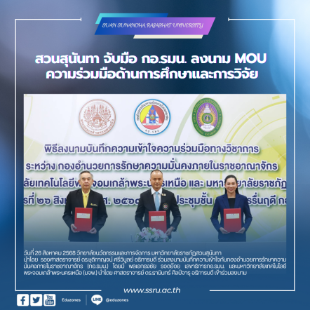 tui sakrapee August 26, 2025 สวนสุนันทา จับมือ กอ.รมน. ลงนาม MOU ความร่วมมือด้านการศึกษาและการวิจัย tui sakrapee August 26, 2025 วันที่ 26 สิงหาคม 2568 วิทยาลัยนวัตกรรมและการจัดการ มหาวิทยาลัยราชภัฏสวนสุนันทา นำโดย รองศาสตราจารย์ ดร.ชุติกาญจน์ ศรีวิบูลย์ อธิการบดี ร่วมลงนามบันทึกความเข้าใจกับ กองอำนวยการรักษาความมั่นคงภายในราชอาณาจักร (กอ.รมน.) โดยมี พลเอก ธงชัย รอดย้อย เลขาธิการ กอ.รมน. และ มหาวิทยาลัยเทคโนโลยีพระจอมเกล้าพระนครเหนือ (มจพ.) นำโดย ศาสตราจารย์ ดร.ธานินทร์ ศิลป์จารุ อธิการบดี เข้าร่วมลงนาม บันทึกความเข้าใจฉบับนี้มีวัตถุประสงค์เพื่อส่งเสริมความร่วมมือด้านการศึกษาและการวิจัย มุ่งเน้นการพัฒนาบุคลากรของ กอ.รมน.… Continue Reading