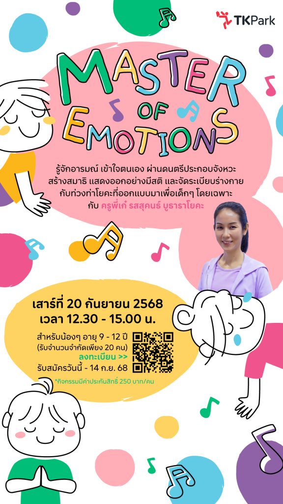 EZ Webmaster September 5, 2025 EZ Webmaster September 5, 2025 TK Park จัดกิจกรรม “Master of Emotions” ชวนเด็กเรียนรู้การเข้าใจอารมณ์และจัดระเบียบร่างกาย TK Park จัดกิจกรรม “Master of Emotions” ชวนเด็กเรียนรู้การเข้าใจอารมณ์และจัดระเบียบร่างกาย อุทยานการเรียนรู้ TK Park เชิญชวนเด็กอายุ 9 – 12 ปี ร่วมกิจกรรม Master of Emotions: เข้าใจอารมณ์ จัดระเบียบร่างกาย” เพื่อเรียนรู้การเข้าใจและจัดการอารมณ์อย่างสร้างสรรค์ ผ่านการฝึกโยคะที่ออกแบบเฉพาะสำหรับเด็ก โดยผสมผสานศิลปะ ดนตรี และกิจกรรม ช่วยพัฒนาทักษะสมอง EF (Executive Functions) และเสริมความมั่นใจในตนเอง กิจกรรมนี้ได้รับเกียรติจาก ครูพี่เก๋ – รสสุคนธ์ ซันจวน บูธาราไลฟ์ ครูโยคะวิชาชีพจากสหรัฐอเมริกา ผู้เชี่ยวชาญด้านโยคะเด็ก และ โยคะบำบัด จะมาร่วมถ่ายทอดเทคนิคและประสบการณ์เพื่อการพัฒนากายใจอย่างสมดุล ในวันเสาร์ที่ 20 กันยายน 2568 เวลา 12.30 – 15.00 น. ที่ห้องเวิร์กช้อป 1-2 อุทยานการเรียนรู้ TK Park ชั้น 8 ศูนย์การค้าเซ็นทรัลเวิลด์ สามารถลงทะเบียนล่วงหน้าได้ที่ https://forms.gle/nBbS6UZkoquZHLEw8 (จำกัดจำนวน 20 ท่าน) หรือ สอบถามรายละเอียดเพิ่มเติม โทร. 0 2257 4300 หรือ LINE: @TKpark