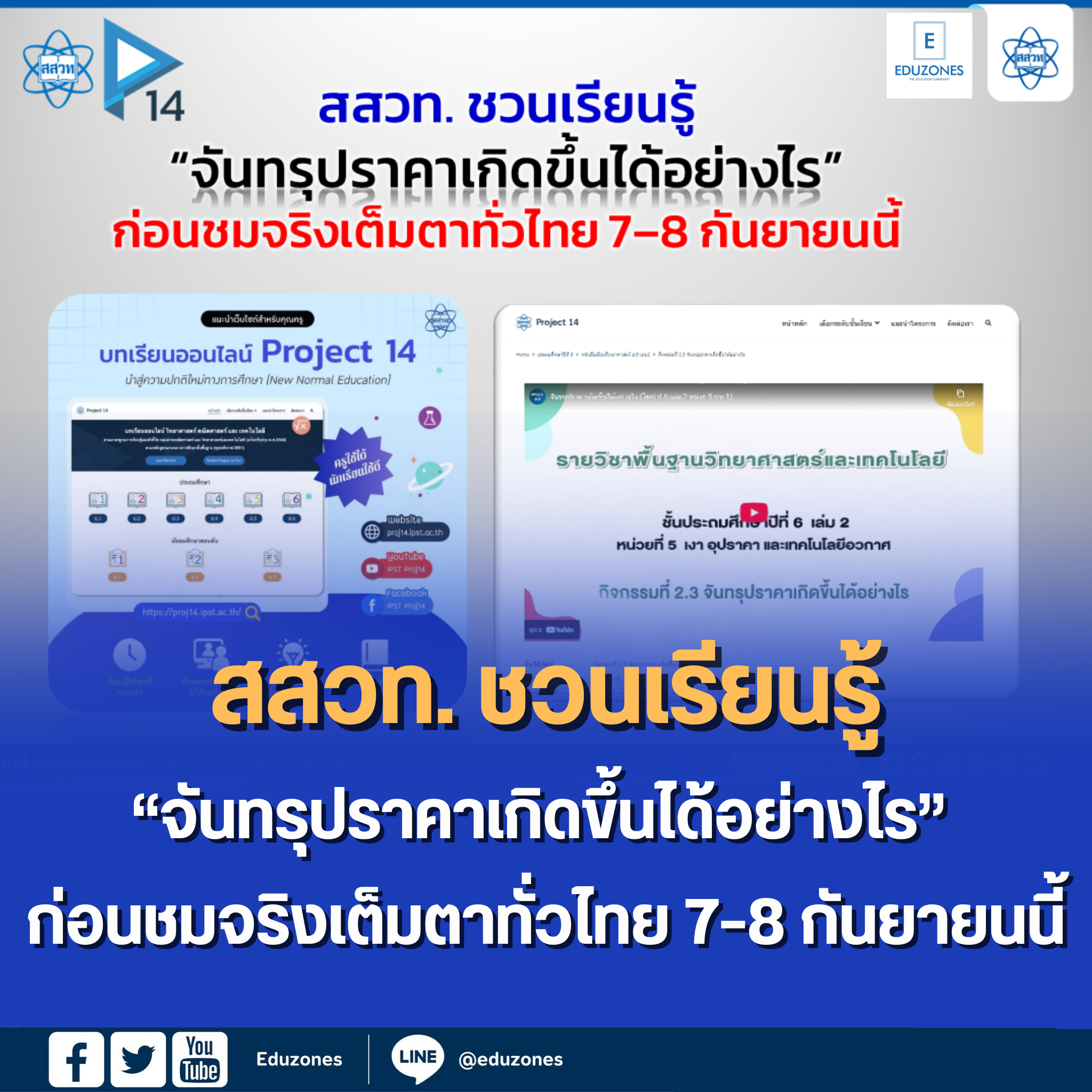 EZ Webmaster September 10, 2025 EZ Webmaster September 10, 2025 สสวท. ชวนเรียนรู้ “จันทรุปราคาเกิดขึ้นได้อย่างไร” ก่อนชมจริงเต็มตาทั่วไทย 7–8 กันยายนนี้ สสวท. ชวนเรียนรู้ “จันทรุปราคาเกิดขึ้นได้อย่างไร” ก่อนชมจริงเต็มตาทั่วไทย 7–8 กันยายนนี้ สถาบันส่งเสริมการสอนวิทยาศาสตร์และเทคโนโลยี (สสวท.) ชวนครู นักเรียน และผู้สนใจทั่วไป ร่วมเรียนรู้ปรากฏการณ์ จันทรุปราคา ซึ่งเป็นปรากฏการณ์ดาราศาสตร์ที่สามารถสังเกตเห็นได้จากบนโลก พร้อมชมจริงวันที่ 7–8 กันยายนนี้ โดยจันทรุปราคามี 3 ประเภท ได้แก่ จันทรุปราคาเต็มดวง จันทรุปราคาบางส่วน และจันทรุปราคาเงามัว เพื่อให้เข้าใจหลักการเกิดได้อย่างชัดเจน สสวท. จึงได้จัดทำ วีดิทัศน์ “จันทรุปราคาเกิดขึ้น ได้อย่างไร” ในรายวิชาพื้นฐานวิทยาศาสตร์และเทคโนโลยี ระดับประถมศึกษาปีที่ 6 เล่ม 2 หน่วยการเรียนรู้เรื่องเงา อุปราคา และเทคโนโลยีอวกาศ พร้อมกิจกรรมสร้างแบบจำลองการเกิดจันทรุปราคาอย่างง่าย โดยใช้อุปกรณ์รอบตัว เช่น ไฟฉาย ดินน้ำมัน ไม้เสียบ และกระดาษแข็ง เพื่อกระตุ้นการเรียนรู้และทำความเข้าใจเชิงวิทยาศาสตร์ ครูและนักเรียนสามารถเรียนรู้ร่วมกันได้ทางแพลตฟอร์มออนไลน์ Project 14 สสวท. คลิกที่ https://proj14.ipst.ac.th/p6/p6-sci-book2/sci-p6b2-018