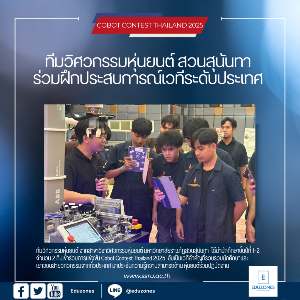 tui sakrapee September 10, 2025 tui sakrapee September 10, 2025 ทีมวิศวกรรมหุ่นยนต์ สวนสุนันทา ร่วมฝึกประสบการณ์เวทีระดับประเทศ Cobot Contest Thailand 2025 การแข่งขัน Cobot Contest Thailand 2025 จัดขึ้นระหว่างวันที่ 26–27 มิถุนายน 2568 ณ มหาวิทยาลัยเทคโนโลยีราชมงคลอีสาน วิทยาเขตขอนแก่น โดยมี บริษัท เอ็มที สตั๊ดดี้เทค จำกัด เป็นผู้จัดงาน ซึ่งนับเป็นเวทีสำคัญที่รวบรวมนักศึกษาและเยาวชนสายวิศวกรรมจากทั่วประเทศ มาประชันความรู้ความสามารถด้าน หุ่นยนต์ร่วมปฏิบัติงาน (Collaborative Robot: Cobot) ทีมวิศวกรรมหุ่นยนต์ จากสาขาวิชาวิศวกรรมหุ่นยนต์ มหาวิทยาลัยราชภัฏสวนสุนันทา ได้นำนักศึกษาชั้นปีที่ 1–2 จำนวน 2 ทีมเข้าร่วมการแข่งขัน ได้แก่ 1. ทีมวิศวกรรมหุ่นยนต์ อาร์อี 02 • นายวุฒิพร มากมี • นายดุลยวัต ปุญญรัตนศรีขจร • นายปรเมศวร์ บุตรนิล 2. ทีมวิศวกรรมหุ่นยนต์ อาร์อี 01 • นายจักรพรรดิ ขาวสง่า • นายณัฐพงษ์ กาจนะหุต • นายศุภณัญ หนูประดิษฐ์ ตลอดการแข่งขัน นักศึกษาได้แสดงให้เห็นถึงพลังแห่งความคิดสร้างสรรค์ ความสามารถเชิงเทคนิค และการทำงานเป็นทีมอย่างเข้มแข็ง โดยมีคณาจารย์ที่ปรึกษาและควบคุมดูแลอย่างใกล้ชิด ได้แก่ • ดร.ปฏิญญา สมานุหัตถ์ • ดร.อภิรักษ์ ธิตินฤมิต (สาขาวิศวกรรมหุ่นยนต์) • ผศ.ปฏิญญาณ์ แสงอรุณ (สาขาการออกแบบผลิตภัณฑ์และบรรจุภัณฑ์) นอกจากนี้ ยังได้รับการสนับสนุนค่าใช้จ่ายด้านการฝึกซ้อมและการแข่งขันจาก บริษัท เพอร์เฟค ไดแด๊กติก จำกัด ซึ่งมีส่วนสำคัญในการผลักดันให้นักศึกษาได้มีโอกาสก้าวสู่สนามการแข่งขันระดับประเทศ