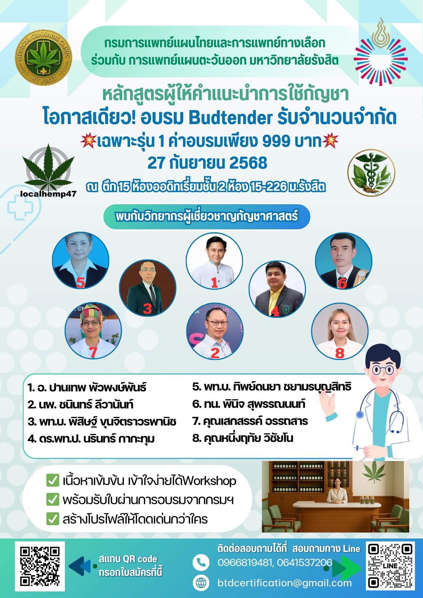 ในวันเสาร์ที่ 27 กันยายน 2568 เวลา 09.00-16.00 น. ณ ห้องออดิทอเรียม ชั้น 2 ห้อง 15-226 อาคาร 15 มหาวิทยาลัยรังสิต เพื่อให้ผู้เข้ารับการอบรมมีความรู้ความเข้าใจและทักษะการใช้กัน ชาทางการแพทย์ สามารถปฏิบัติตามประกาศกระทรวงสาธารณสุข เรื่อง สมุนไพรควบคุม (กัน ชา) ได้อย่างถูกต้อง
