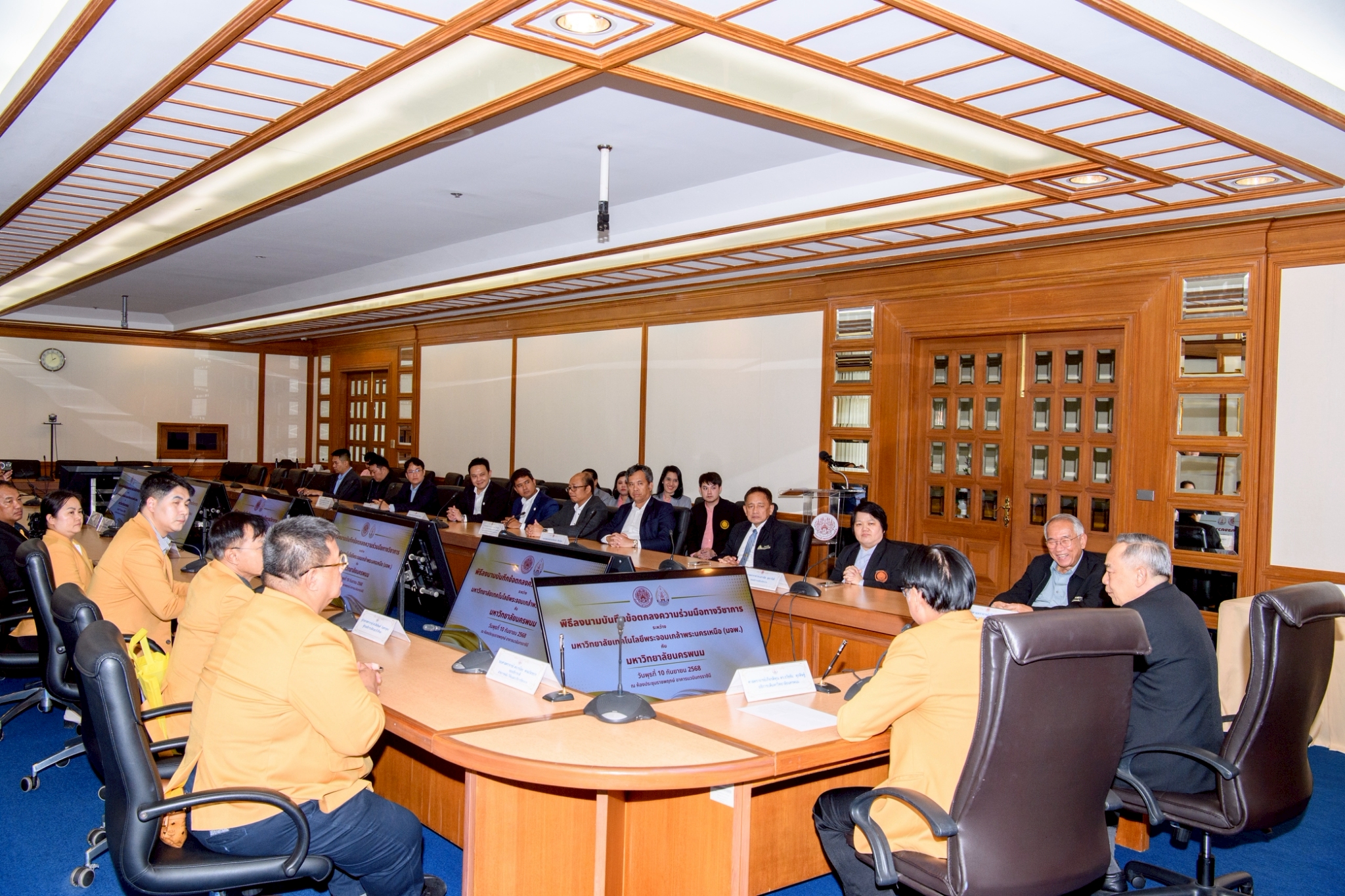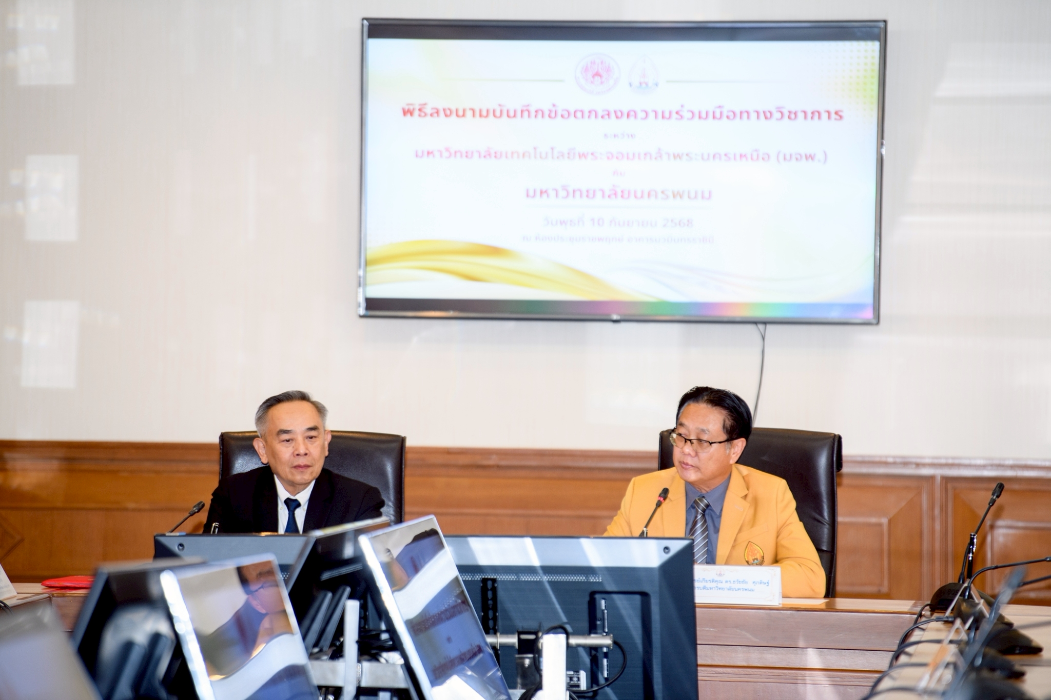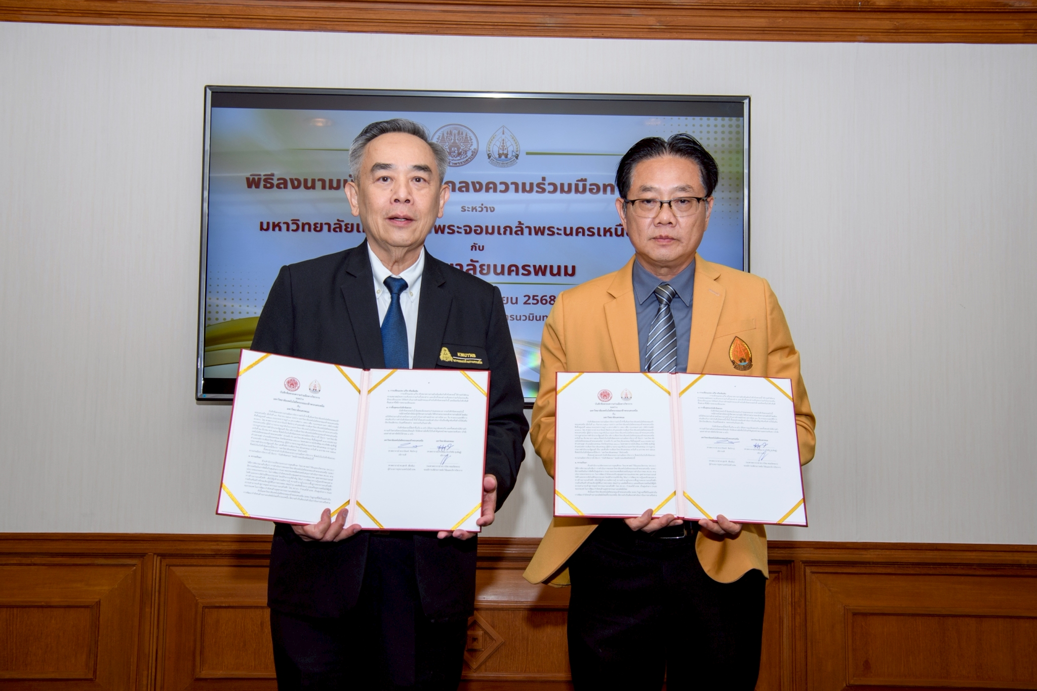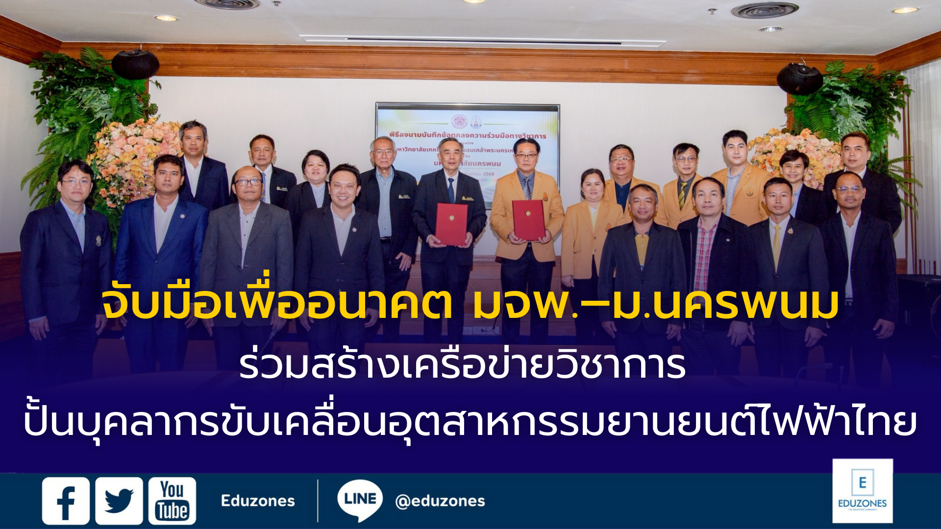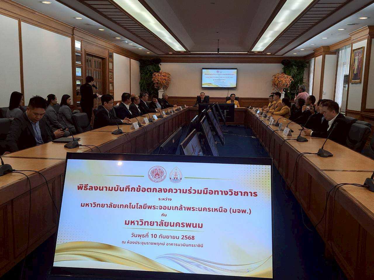EZ Webmaster September 18, 2025 EZ Webmaster September 18, 2025 จับมือเพื่ออนาคต มจพ.–ม.นครพนม ร่วมสร้างเครือข่ายวิชาการ ปั้นบุคลากรขับเคลื่อนอุตสาหกรรมยานยนต์ไฟฟ้าไทย จับมือเพื่ออนาคต มจพ.–ม.นครพนม ร่วมสร้างเครือข่ายวิชาการ ปั้นบุคลากรขับเคลื่อนอุตสาหกรรมยานยนต์ไฟฟ้าไทย ศ.ดร.ธานินทร์ ศิลป์จารุ อธิการบดี มหาวิทยาลัยเทคโนโลยีพระจอมเกล้าพระนครเหนือ (มจพ.) คณะผู้บริหาร ร่วมให้การต้อนรับ ศ.เกียรติคุณ ดร.ธวัชชัย ศุภดิษฐ์ อธิการบดี มหาวิทยาลัยนครพนม พร้อมด้วย คณะผู้บริหาร มหาวิทยาลัยนครพนม ร่วมพิธีลงนามในบันทึกข้อตกลงความร่วมมือทางวิชาการระหว่างกัน ในวันที่ 10 กันยายน 2568 ณ ห้องประชุมราชพฤกษ์ อาคารนวมินทรราชินี ความร่วมมือทางวิชาการดังกล่าว มีวัตถุประสงค์เพื่อขยายเครือข่ายความร่วมมือในการผลิตและพัฒนากำลังคนรองรับอุตสาหกรรมยานยนต์สมัยใหม่ รวมทั้งอุตสาหกรรมอื่นที่เกี่ยวข้องร่วมกัน พัฒนาคณาจารย์ของมหาวิทยาลัยนครพนมให้เป็นผู้ฝึกอบรมมืออาชีพในอุตสาหกรรมยานยนต์ไฟฟ้าและอุตสาหกรรมอื่นที่เกี่ยวข้อง เพื่อส่งเสริมการทำวิจัยและสร้างนวัตกรรมสิ่งประดิษฐ์ร่วมกันเพื่อประโยชน์สาธารณะด้านการศึกษาและอุตสาหกรรมของประเทศ การส่งเสริมความร่วมมือในการบริการวิชาการสู่สังคมและประเทศชาติตามพันธกิจของทั้งสองมหาวิทยาลัย ตลอดจนบูรณาการบุคลากรในการจัดสัมมนา และจัดประชุมวิชาการระดับชาติ และนานาชาติด้านวิทยาศาสตร์และเทคโนโลยีร่วมกัน โดยมีระยะเวลาการดำเนินการ 3 ปี สืบเนื่องจาก มหาวิทยาลัยเทคโนโลยีพระจอมเกล้าพระนครเหนือ (มจพ.) มีความพร้อมในการจัดตั้งเป็นศูนย์กลาง (Hub) ของประเทศเพื่อช่วยสนับสนุนการดำเนินการของ สป.อว. ตามนโยบายของกระทรวง อว.ในการพัฒนากำลังคนรองรับกลุ่มอุตสาหกรรมแห่งอนาคต : อุตสาหกรรมยานยนต์ไฟฟ้าและระบบอัตโนมัติของประเทศ มจพ. ในฐานะที่ได้เป็นแม่ข่ายในการพัฒนากำลังคนด้านยานยนต์สมัยใหม่ทั้งประเทศนั้นมีความจำเป็นต้องเร่งดำเนินการในการหาเครือข่ายพันธมิตร และ ได้เล็งเห็นถึงความพร้อมและความมุ่งมั่นตั้งใจของมหาวิทยาลัยนครพนมที่มีเจตนาและให้ความสำคัญในการผลิตและพัฒนากำลังคนเพื่อรองรับกลุ่มอุตสาหกรรมยานยนต์สมัยใหม่ โดยเฉพาะสถานศึกษา และภาคอุตสาหกรรมที่ตั้งอยู่ในภาคตะวันออกเฉียงเหนือและพื้นที่ใกล้เคียงให้ได้มีโอกาสในการพัฒนาทักษะ (upskill/reskill/ new skill) เพื่อตอบสนองความต้องการในการผลิตกำลังคนด้านอุตสาหกรรมยานยนต์ไฟฟ้าและอุตสาหกรรมอื่นที่เกี่ยวข้องอย่างเร่งด่วนทั้งในประเทศและต่างประเทศ