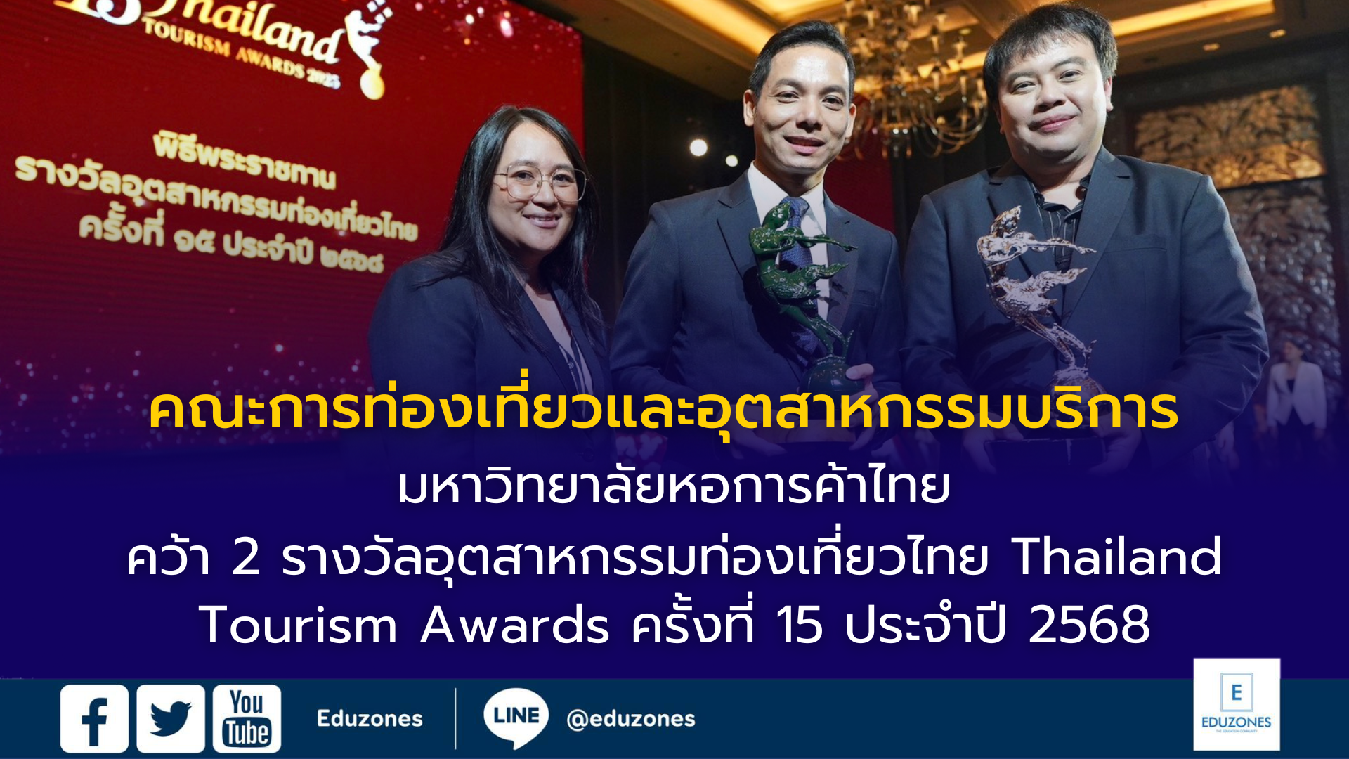 EZ Webmaster September 29, 2025 EZ Webmaster September 29, 2025 คณะการท่องเที่ยวและอุตสาหกรรมบริการ มหาวิทยาลัยหอการค้าไทย คว้า 2 รางวัล อุตสาหกรรมท่องเที่ยวไทย Thailand Tourism Awards ครั้งที่ 15 ประจำปี 2568 คณะการท่องเที่ยวและอุตสาหกรรมบริการ มหาวิทยาลัยหอการค้าไทย คว้า 2 รางวัลอุตสาหกรรมท่องเที่ยวไทย Thailand Tourism Awards ครั้งที่ 15 ประจำปี 2568 ผู้ช่วยศาสตราจารย์ ดร.ยงยุทธ แก้วอุดม คณบดีคณะการท่องเที่ยวและอุตสาหกรรมบริการ มหาวิทยาลัยหอการค้าไทย (กลาง) เข้ารับมอบ 2 รางวัล อุตสาหกรรมท่องเที่ยวไทย Thailand Tourism Awards ครั้งที่ 15 ประจำปี 2568 โดยทูลกระหม่อมหญิงอุบลรัตนราชกัญญา สิริวัฒนาพรรณวดี เสด็จเป็นองค์ประธานในพิธีและพระราชทานรางวัล ประเภทองค์กรสนับสนุนและส่งเสริมการท่องเที่ยวยั่งยืน “รางวัลดีเด่น และรางวัลแห่งความยั่งยืน” จัดโดย การท่องเที่ยวแห่งประเทศไทย พร้อมด้วย ดร.รุจิภาส บุญสำเร็จ รองคณบดีฝ่ายกิจการนักศึกษา (ขวา) และ ดร.มนรัตน์ ใจเอื้อ รองคณบดีฝ่ายวิชาการ (ซ้าย) ร่วมแสดงความยินดี เมื่อเร็ว ๆ นี้ ณ โรงแรม แกรนด์ไฮแอท เอราวัณ กรุงเทพฯ