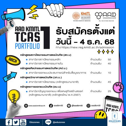 EZ Webmaster September 28, 2025 AAD KMITL TCAS 1 (Portfolio) รอบแรกมาแล้ว EZ Webmaster September 28, 2025 🔥 AAD KMITL TCAS 1 (Portfolio) รอบแรกมาแล้ว! 🔥 คณะสถาปัตยกรรม ศิลปะและการออกแบบสถาบันเทคโนโลยีพระจอมเกล้าเจ้าคุณทหารลาดกระบัง 📌 เปิดรับสมัคร 5 สาขา ดังนี้✨ สถาปัตยกรรมหลัก – รับ 50 คน✨ สถาปัตยกรรมภายใน – รับ 40 คน✨ การออกแบบประสบการณ์สำหรับสื่อบูรณาการ – รับ 10 คน✨ สถาปัตยกรรม (นานาชาติ)… Continue Reading