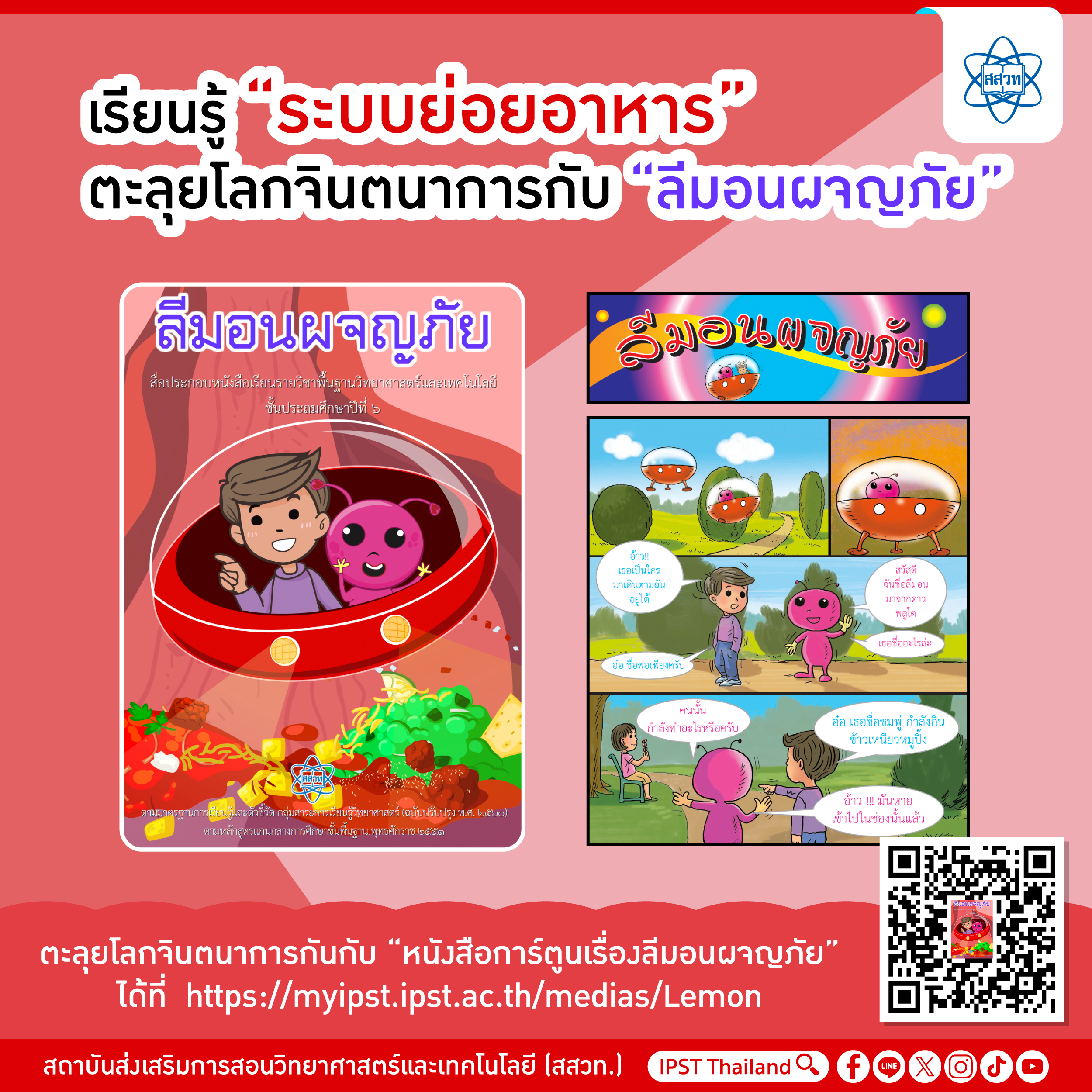 EZ Webmaster October 1, 2025 EZ Webmaster October 1, 2025 เรียนรู้ “ระบบย่อยอาหาร” ตะลุยโลกจินตนาการกับ “ลีมอนผจญภัย” เรียนรู้ “ระบบย่อยอาหาร” ตะลุยโลกจินตนาการกับ “ลีมอนผจญภัย” “พลังงาน” เป็นแรงขับเคลื่อน อวัยวะทุกส่วนของร่างกายจึงจะเดินหน้าไปได้อย่างราบรื่น หลังอิ่มอร่อย ไข่เจียว ข้าวเหนียว หมูปิ้ง และอีกสารพัดเมนู เมื่ออาหารถูกกลืนหายวับลงไปในท้องแล้ว ระหว่างทางที่อยู่ในร่างกายเดินทางไปที่ไหนกันบ้าง หรือแวะที่ไหน แปลงร่าง เป็นอะไรหรือเปล่าเอ่ย ติ๊กต่อก ติ๊กต่อก เรียนหรือเล่นก็เป็นสุข ไปสนุกตะลุยโลกจินตนาการกันกับ “หนังสือการ์ตูนเรื่องลีมอนผจญภัย”สื่อการเรียนรู้เกี่ยวกับ ระบบย่อยอาหาร นำเสนอในรูปแบบการ์ตูน 4 สี เพื่อให้นักเรียนได้ศึกษาเรื่องลักษณะและหน้าที่ของอวัยวะในระบบย่อยอาหาร สื่อประกอบการเรียนวิทยาศาสตร์และเทคโนโลยี สสวท. ประถมศึกษาปีที่ 6 กับหนังสือการ์ตูนออนไลน์ สีสันสดใส เข้าใจง่าย แถมมีคำศัพท์เกี่ยวกับอวัยวะการย่อยอาหารให้ท้ายเล่มอีกด้วย อธิบายการทำงานของระบบย่อยอาหารและการทำงานของอวัยวะต่างๆ ภายในร่างกาย กระตุ้นความสนใจเรียนรู้เหมาะกับวัยของผู้เรียน โดยใช้การ์ตูนเป็นสื่อในการเข้าถึง พร้อมหรือยัง ไปผจญภัยกันเลยกับสองสหาย ลีมอน และ พอเพียง วันนี้เราเดินทางตามติดข้าวเหนียวหมูปิ้งที่หายเข้าไป ในร่างกายมนุษย์ว่าไปสุดที่ไหน เดินทางผ่านอวัยวะใดบ้างตามลำดับ แต่ละอวัยวะทำหน้าที่หลักอย่างไร มีตัวช่วยอะไรในการย่อยรวมทั้งเปลี่ยนแปลงเป็นพลังงานในการดำรงชีวิตของมนุษย์ ถ้าเรียกตามเกม หรือ ซีรีส์ก็อาจเรียกเท่ห์ ๆ ว่าฝ่าด่านเคราะห์ หรือมีไอเท่มอะไรช่วยบ้าง ยานของสองเกลอพร้อมแล้ว ท่องดินแดนมหัศจรรย์ภายในร่างกายกันเถอะ โลดแล่นผ่านหลอดอาหารที่บีบลงแล้วค่อยใหญ่ขึ้นตลอดทาง ไม่ต้องตกใจตอนนะ นี่เป็นวิธีดันให้ก้อนอาหารเคลื่อนผ่านลงไปสู่ “กระเพาะอาหาร” ที่มีลักษณะเป็นถุงคล้ายตัว J จินตนาการถึงผนังกระเพาะอาหารที่พับไปพับมาเป็นคลื่นและมีของเหลว คือ เอนไซม์ย่อยโปรตีน แถมยังมีกรดเกลือด้วย แอบดูการย่อยอาหารที่ถูกย่อยจนมีขนาดเล็กลงแล้ว ลุ้นระทึกกันต่อเมื่อยานของสองเกลอร่อนต่อไปถึงลำไส้เล็ก ซึ่งมีเอนไซม์ย่อยคาร์โบไฮเดรตและโปรตีนช่วยจัดการกับเจ้าหมูปิ้งจนอยู่หมัด ส่วนไขมันในหมูปิ้งนั้น ตับ หรืออีกนัยหนึ่ง “พระเอก” อีกคนของเรา ซึ่งสร้างน้ำดีแล้วเก็บไว้ที่ถุงน้ำดี จะส่งมาที่ลำไส้เล็ก ซึ่งน้ำดีนี้แหละที่ทำให้ไขมันแตกตัวมีขนาดเล็กลง การย่อยอาหารก็เสร็จสิ้นที่ลำไส้เล็กนี่เอง หลังจากย่อ